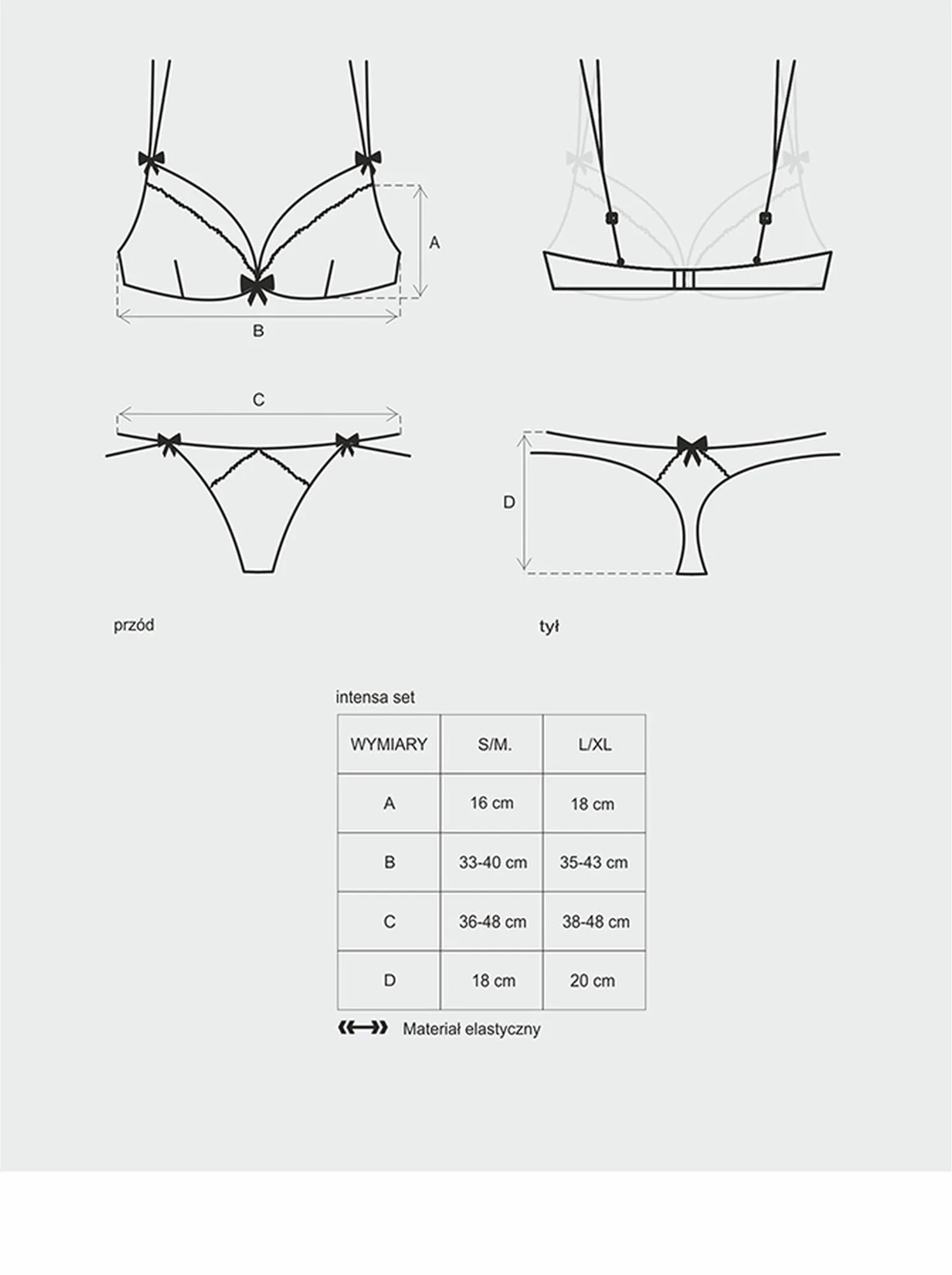 Komplet Intensa wyróżnia się nie tylko swoim estetycznym designem, ale także komfortem noszenia. Słodka kokardka pomiędzy miseczkami biustonosza oraz na stringach dodaje całości niepowtarzalnego uroku. Dwa intrygujące, elastyczne paski oplatające biodra to subtelny detal, który z pewnością przyciągnie uwagę. Wysoka jakość materiałów zapewnia pełną wygodę, dzięki czemu możesz cieszyć się tym wyjątkowym zestawem przez całą noc.