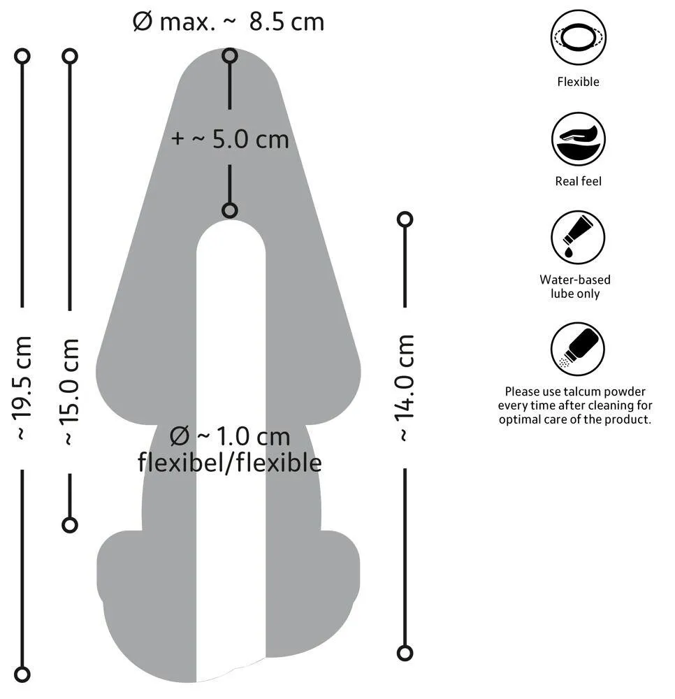 Produkt charakteryzuje się wyjątkową elastycznością, co pozwala na idealne dopasowanie do ciała i jego ruchów. Całkowita długość wynosi 19,5 cm, a głębokość wsunięcia to 14 cm, dzięki czemu można w pełni cieszyć się każdym ruchem. Stożkowa wtyczka zapewnia komfortowe i naturalne uczucie, a wewnętrzna struktura na pewno przypadnie do gustu osobom ceniącym intensywny masaże.