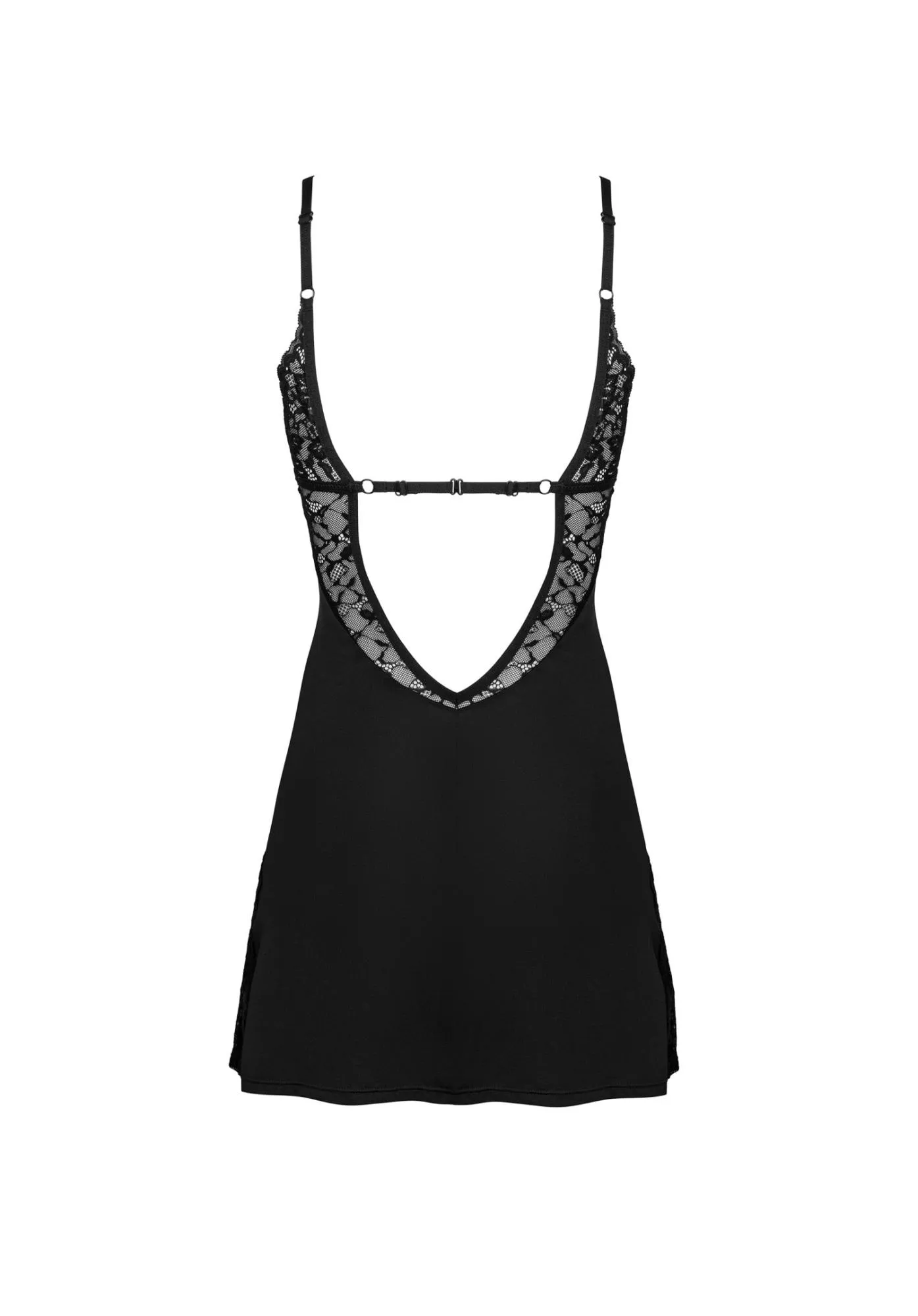 W zestawie znajdziesz zarówno koszulkę, jak i stringi, które zachwycają swoją subtelnością i kobiecością. Fiszbiny w koszulce uwydatniają biust, dodając mu seksownego wyrazu. Dodatkowo, wstawki z misternie wykonanej koronki oraz błyszcząca zawieszka są eleganckimi detalami, które podkreślają indywidualny styl każdej kobiety. Całość utrzymana w klasycznej czerni doskonale wpisuje się w aktualne trendy modowe.