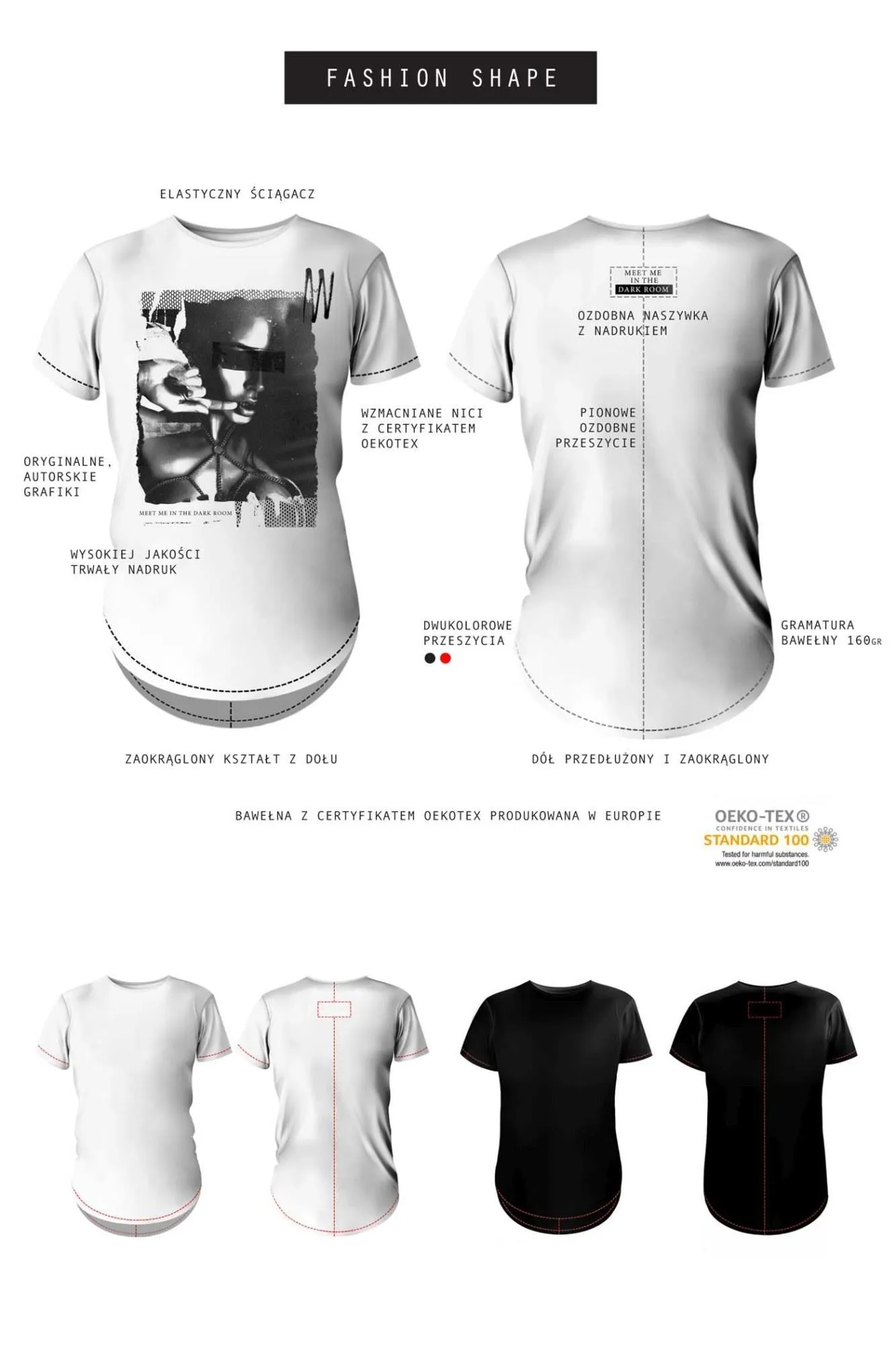 T-shirt oferowany jest w kategorii fashion, z zaokrąglonym kształtem u dołu oraz efektownie ozdobionymi plecami, co czyni go idealnym wyborem dla osób ceniących nietypowe rozwiązania. Wysokiej jakości nadruki, wykonane nowoczesną technologią wodną, są elastyczne i przyjemne w dotyku. Nasze produkty są zaprojektowane i wyprodukowane w Polsce w Unii Europejskiej, co gwarantuje dbałość o każdy detal oraz lokalny charakter naszej marki.