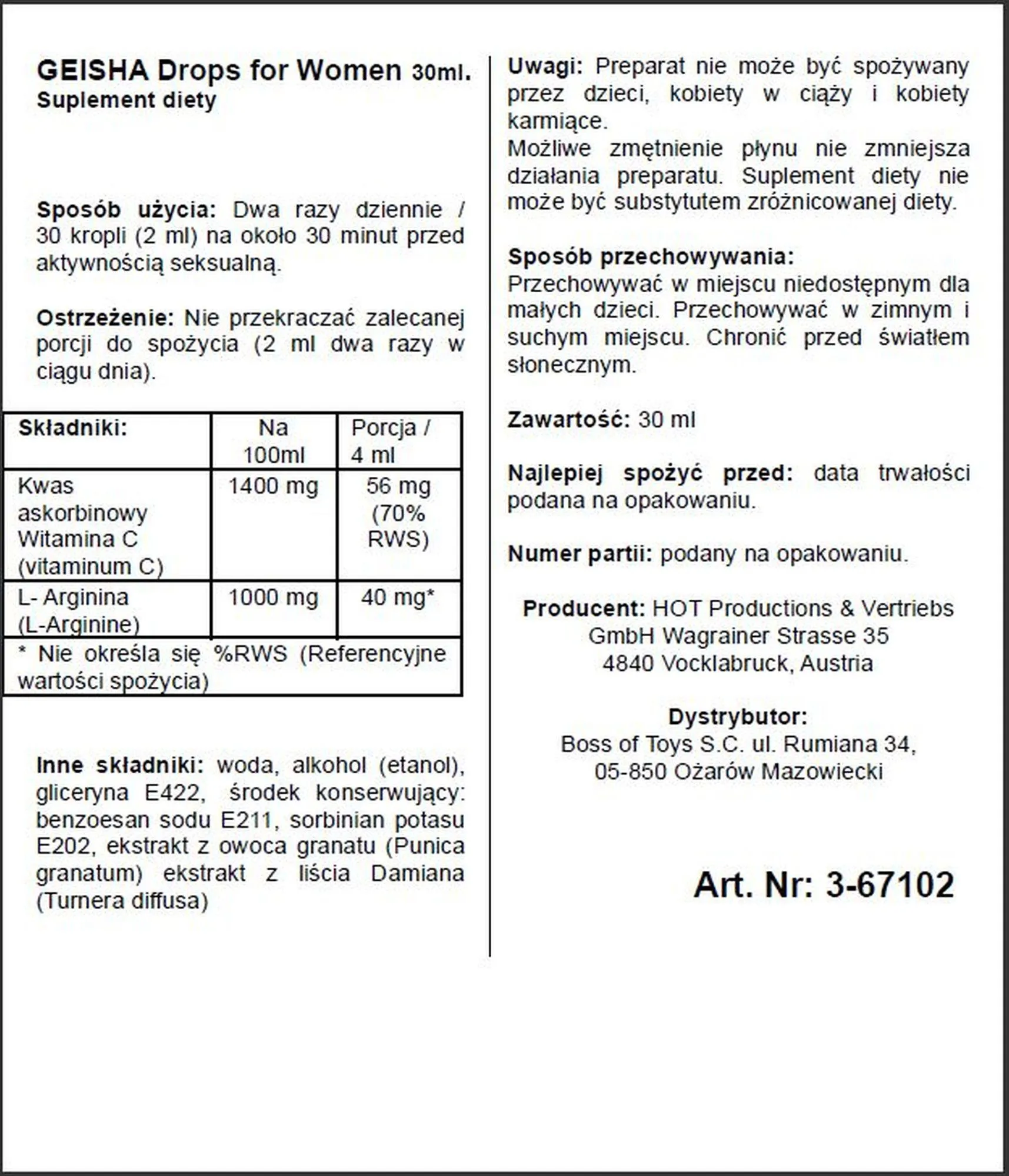W skład naszego produktu wchodzą starannie dobrane składniki, które stymulują pragnienie i pobudzają zmysły. Dzięki temu możesz doświadczyć intensywniejszych emocji oraz pełniejszych przeżyć intymnych. Krople afrodyzjaku są dyskretne i wygodne w użyciu, co sprawia, że można je wykorzystać w różnych okolicznościach.