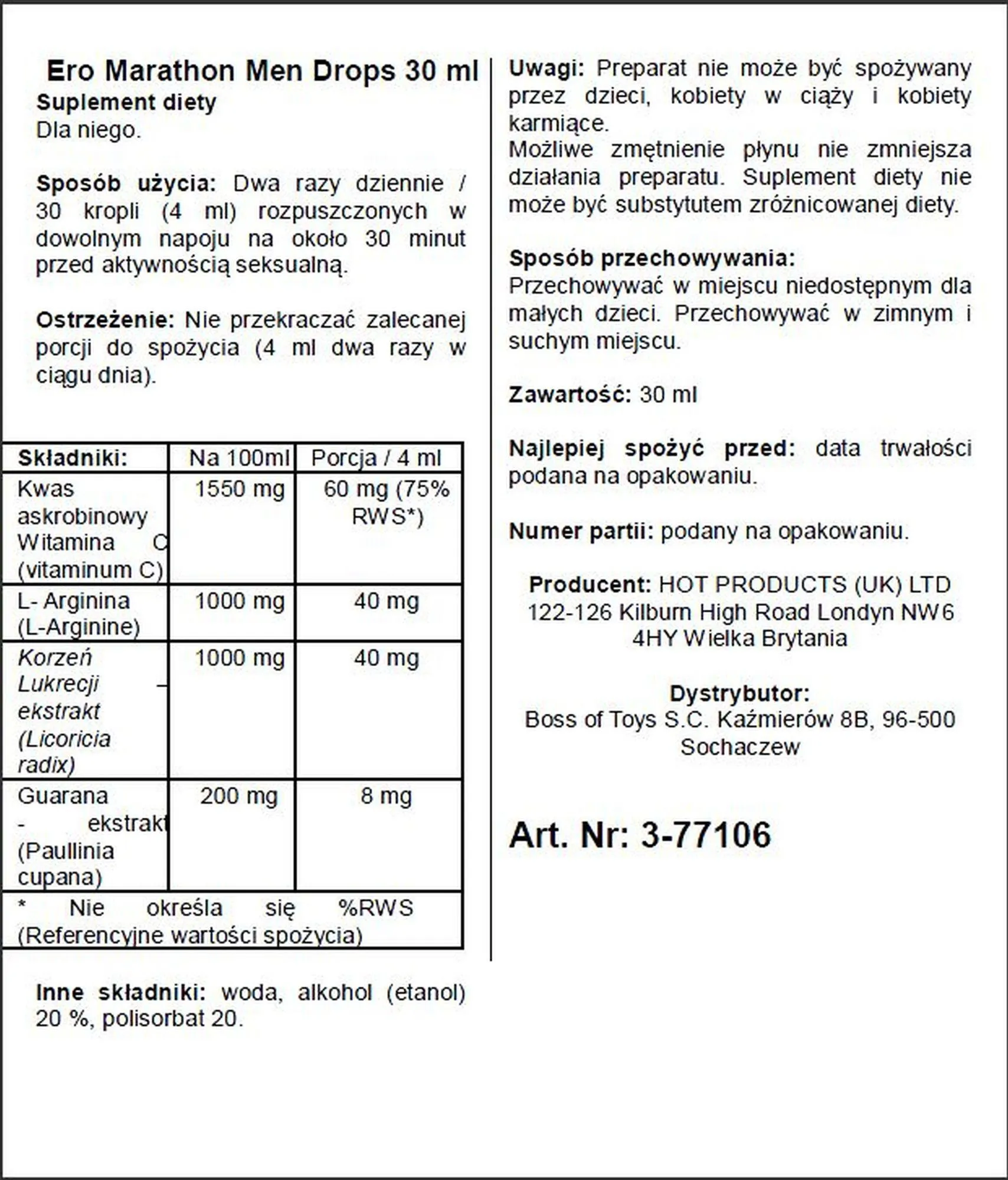 Preparat zalecany jest do stosowania w prosty sposób: wystarczy przyjąć 30 kropli dwa razy dziennie, aby zawsze być gotowym na niezapomniane doświadczenia. Ero Marathon to gwarancja nie tylko satysfakcji, ale i pewności siebie w każdej sytuacji, co pozwoli Ci cieszyć się zmysłowym aspektem życia bez obaw. Przywróć radość do swojego związku i zaskocz swoją partnerkę swoim nowym, intensywnym obliczem.
