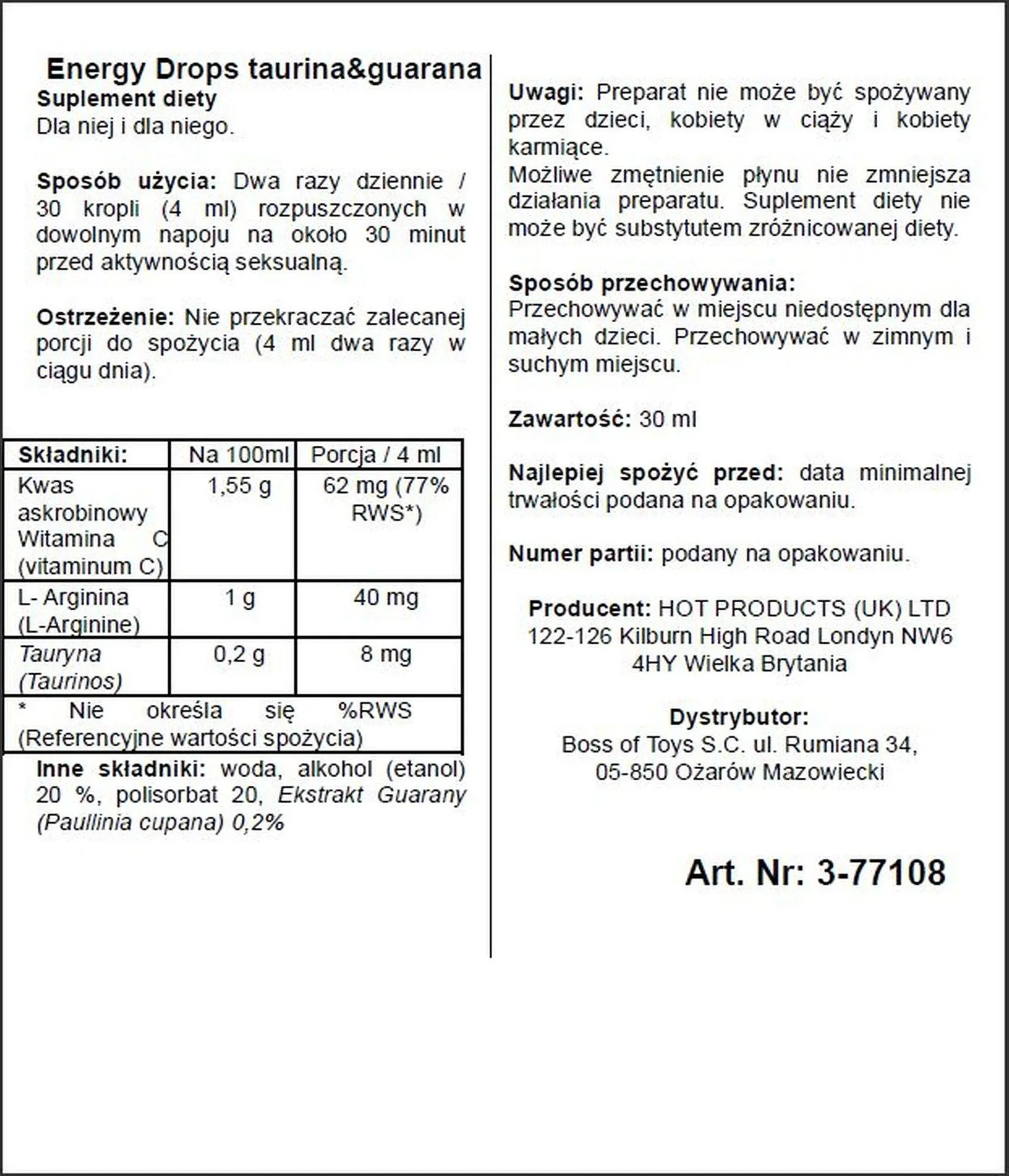 Krople energetyzujące - Suplement diety Taurin & Guarana to zaawansowany preparat stworzony z myślą o mężczyznach i kobietach pragnących zwiększyć swoją energię oraz witalność. Dzięki unikalnej formule opartej na taurynie oraz guaranie, te krople skutecznie dodają energii, umożliwiając pełne korzystanie z życia i jego przyjemności.