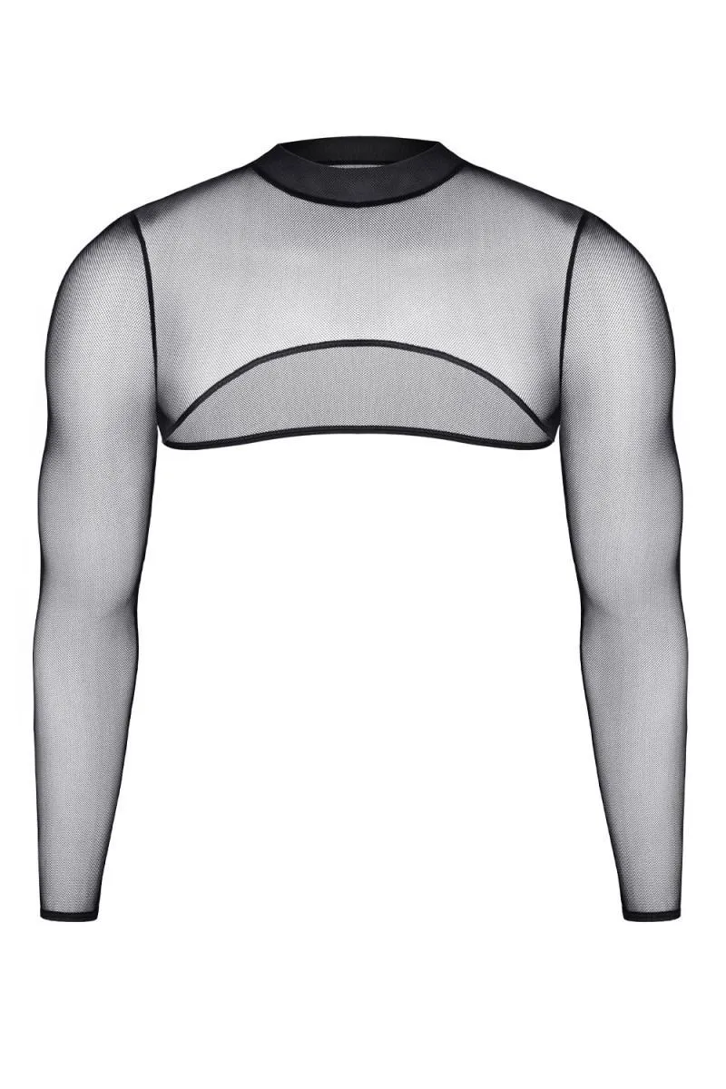 Przedstawiamy krótki top z długimi rękawami, który łączy w sobie oryginalny design z wysoką jakością materiałów. Wykonany z elastycznego i sprężystego tiulu w klasycznym kolorze czarnym, ten top doskonale podkreśla sylwetkę, efektownie poszerzając barki i klatkę piersiową. Jego unikalny krój odkrywa nagie plecy i brzuch, co nadaje mu zmysłowego charakteru.