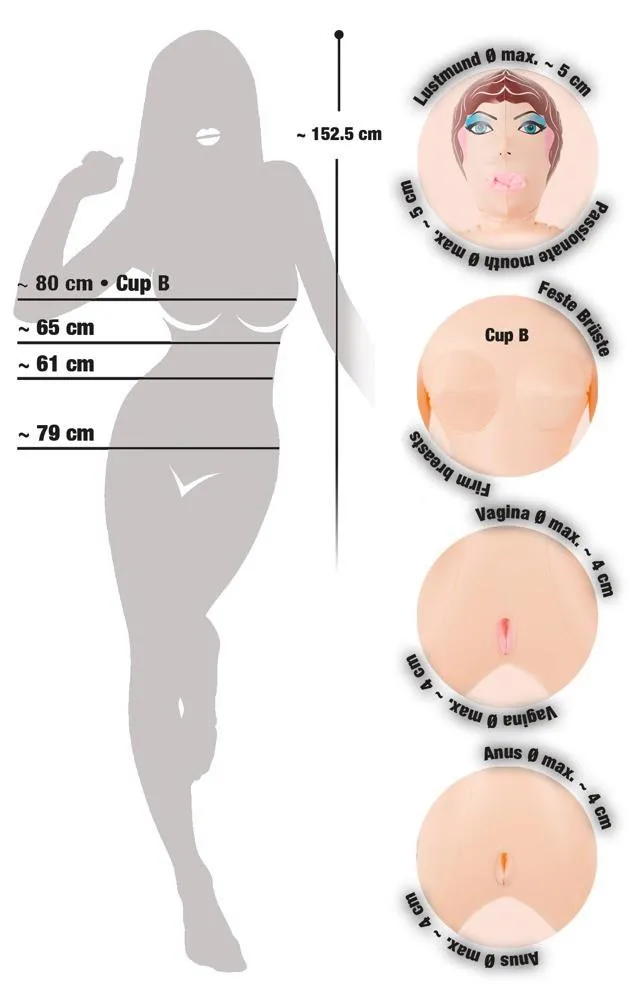 Lalka ma 152 cm wysokości i występuje w wygodnej pozycji stojącej, co sprawia, że jest doskonałym elementem dekoracyjnym w każdej sypialni. Dodatkowo, Joann posiada 3 otwory miłosne, co czyni ją jeszcze bardziej atrakcyjną dla użytkowników poszukujących różnorodnych doznań. Otwory te zapewniają różne głębokości wprowadzenia, co umożliwia dostosowanie do indywidualnych preferencji. Wymiary otworów są następujące: