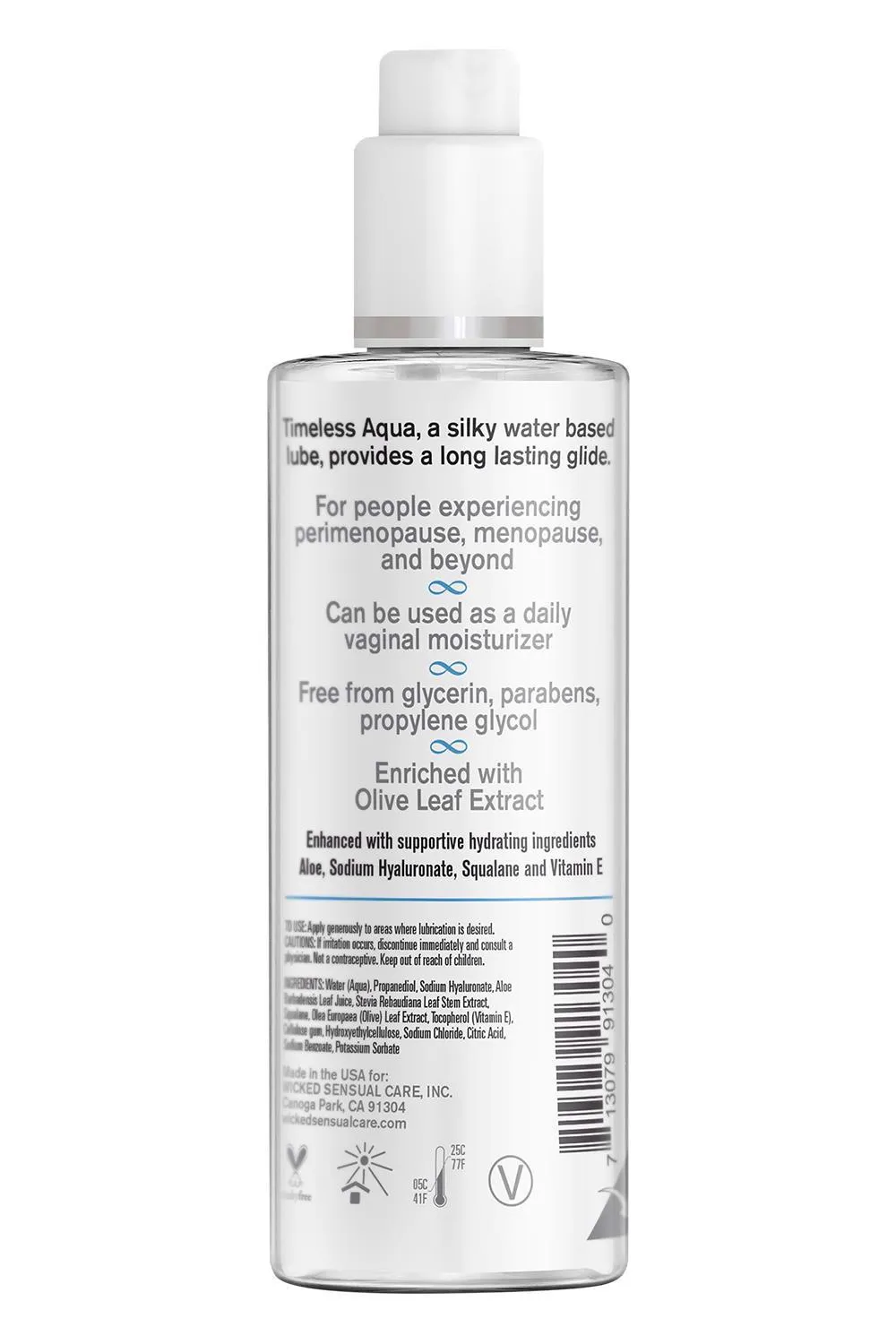 Timeless Aqua powstał w odpowiedzi na zmiany, jakie mogą zachodzić w kobiecym ciele w wyniku menopauzy i starzenia się. Dzięki starannie dobranym składnikom, takim jak sok z aloesu, squalan, witamina E, ekstrakt z liści oliwy oraz kwas hialuronowy, lubrykant ten nie tylko ułatwia stosunek, ale także nawilża i regeneruje delikatne miejsca intymne. Może być używany również jako codzienny nawilżacz pochwy, co czyni go wszechstronnym produktem dzięki którym dbasz o swoje zdrowie i komfort.
