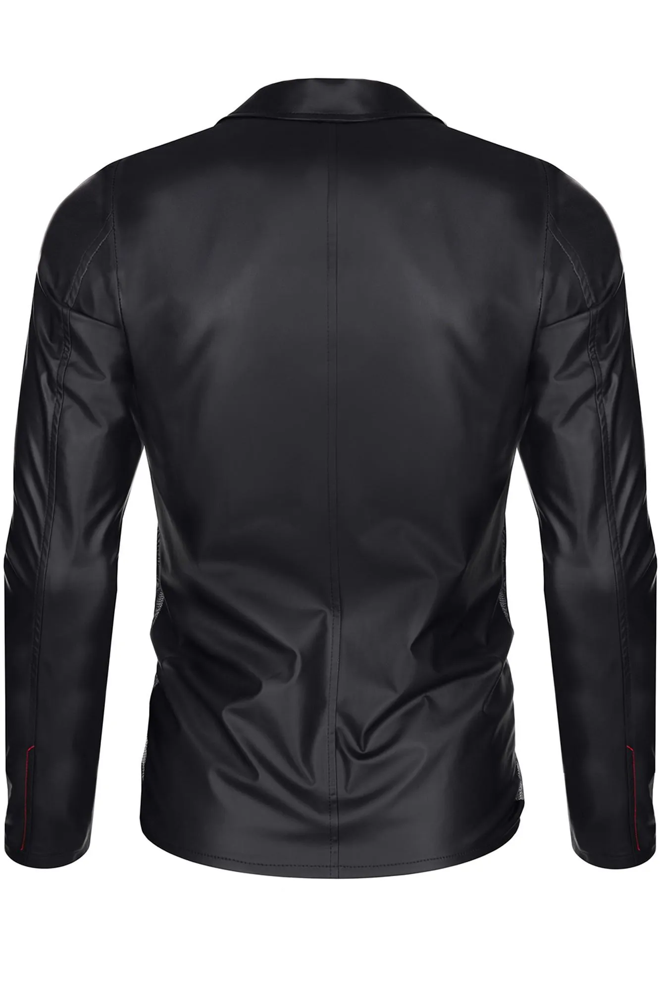 Charakterystyczne wąskie klapy oraz krótki, srebrny ekspres dodają całości szyku i wyrazistości. Przód marynarki eksponuje klatkę piersiową, a pionowe linie na tkaninie wysmuklają sylwetkę, co czyni ją idealnym wyborem dla osób pragnących wyglądać elegancko i modnie. Dodatkowo, czerwone przeszycia oraz subtelna metka z Alcantary z logo RFP są doskonałymi detalami, które podkreślają niepowtarzalny styl marynarki.