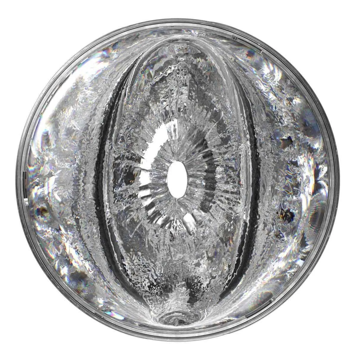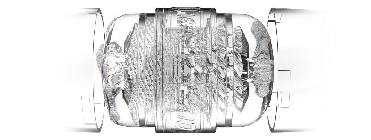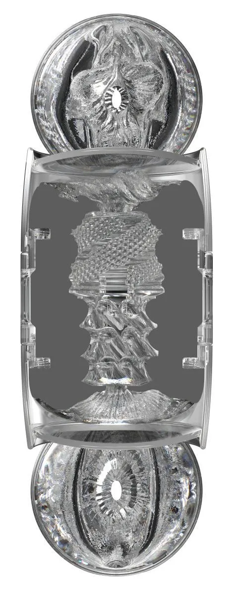 Produkt wykonano z przezroczystego, elastycznego materiału o gładkiej powierzchni zewnętrznej i teksturowanym wnętrzu. Wnętrze zawiera żeliwne żeberka i wypustki, które zostały rozmieszczone w sposób mający na celu intensyfikację doznań zarówno przy użyciu wejścia waginalnego, jak i analnego. Konstrukcja zapewnia realistyczne dopasowanie i jednocześnie umożliwia kontrolę nacisku ręką, co pozwala regulować intensywność stymulacji.