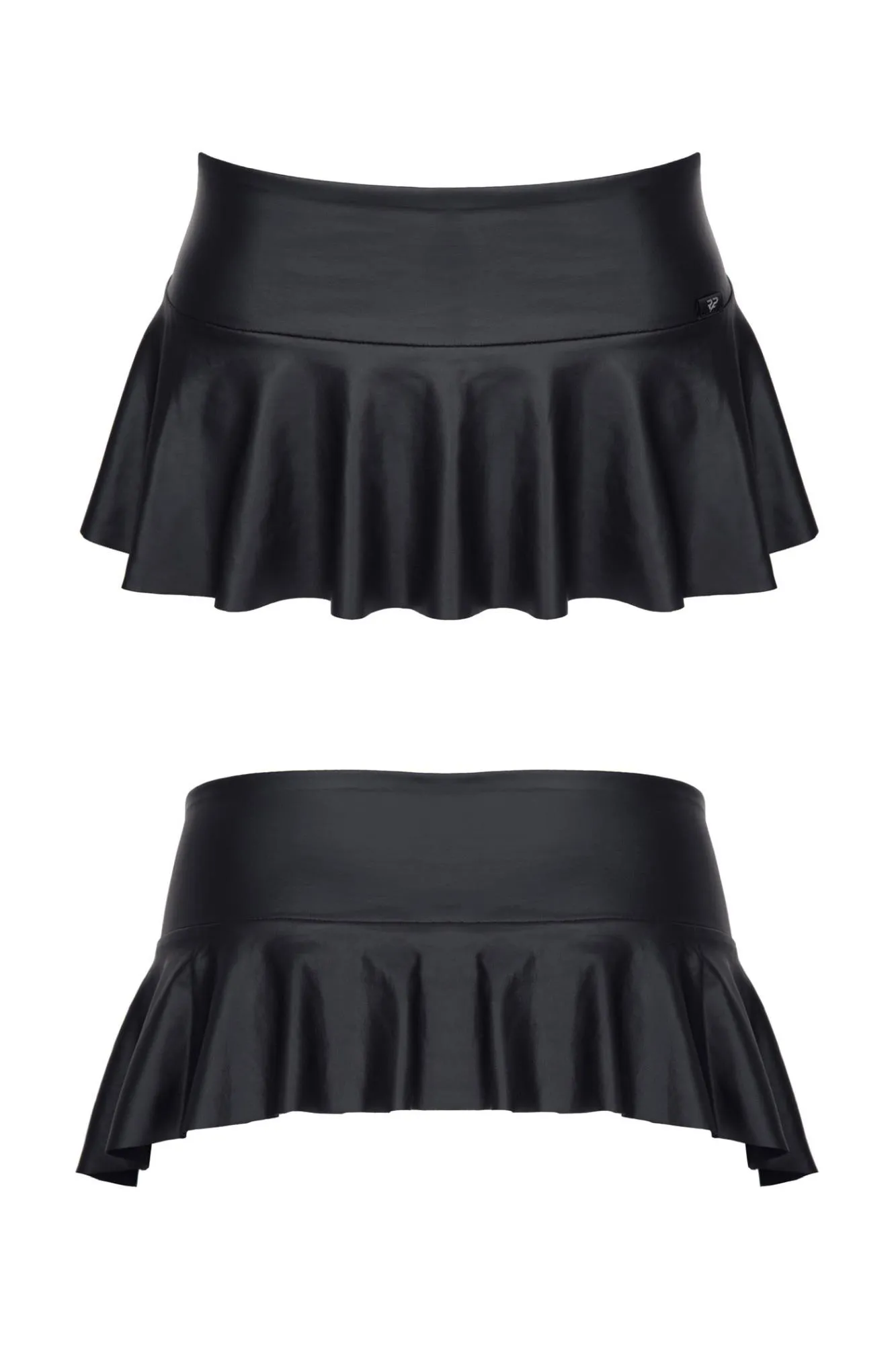 Mini spódniczka męska CRD003 to stylowy element męskiej garderoby, który zachwyca każdym detalem. Wykonana z elastycznego materiału wetlook w klasycznym czarnym kolorze, ta mini spódniczka cechuje się nowoczesnym designem oraz doskonałym dopasowaniem. Przód spódniczki jest dłuższy, co nadaje jej elegancji, podczas gdy skrócony tył subtelnie odsłania dolną część pośladków, podkreślając atuty sylwetki.