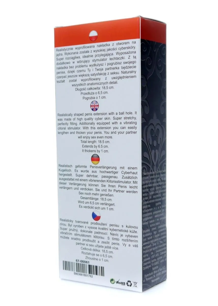 Nakładka ma długość 18,5 cm, co pozwala na wydłużenie Twojego penisa o 6,5 cm, a także jego pogrubienie o 1 cm. Naturalny kształt został zaprojektowany z uwzględnieniem wszystkich anatomicznych detali, co sprawia, że każda chwila spędzona z nią staje się niezapomniana. Dzięki swojemu wodoodpornemu wykończeniu, możesz cieszyć się przyjemnością w każdej okolicy, bez obaw o uszkodzenia.