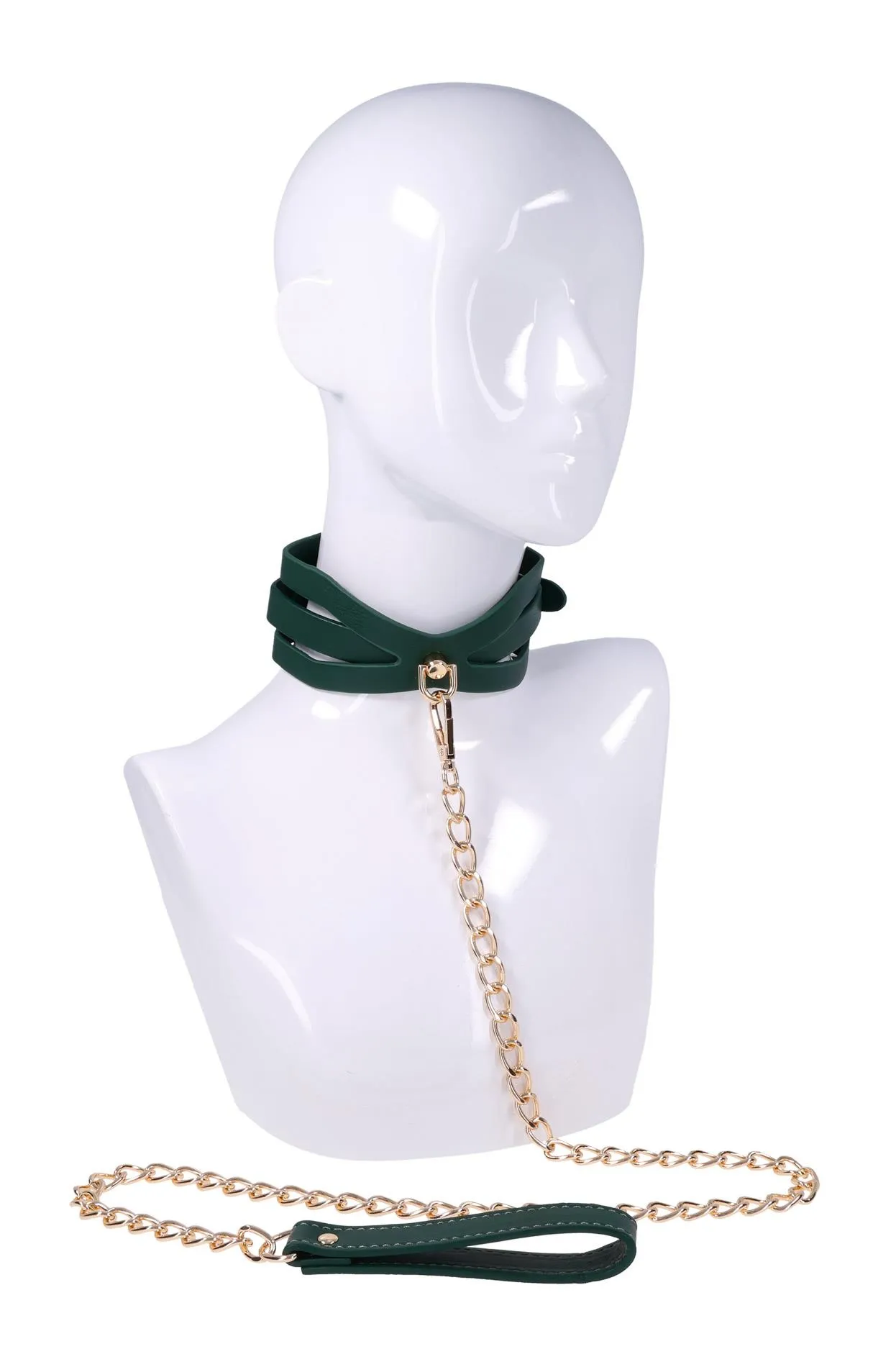 Wykończenie obroży to miękka, aksamitna powłoka o intensywnym, zielonym kolorze, a złote okucia nadają całości luksusowego charakteru. Konstrukcja obejmuje subtelne wycięcia (cutout), które dodają estetycznego akcentu bez kompromisu dla wygody — obroża jest wyściełana, co minimalizuje ryzyko otarć podczas noszenia. Smycz z łańcuchem pozwala na kontrolę pozycji i ruchu, a jednocześnie jest solidnie zamocowana do okuć, gwarantując bezpieczeństwo użytkowania.