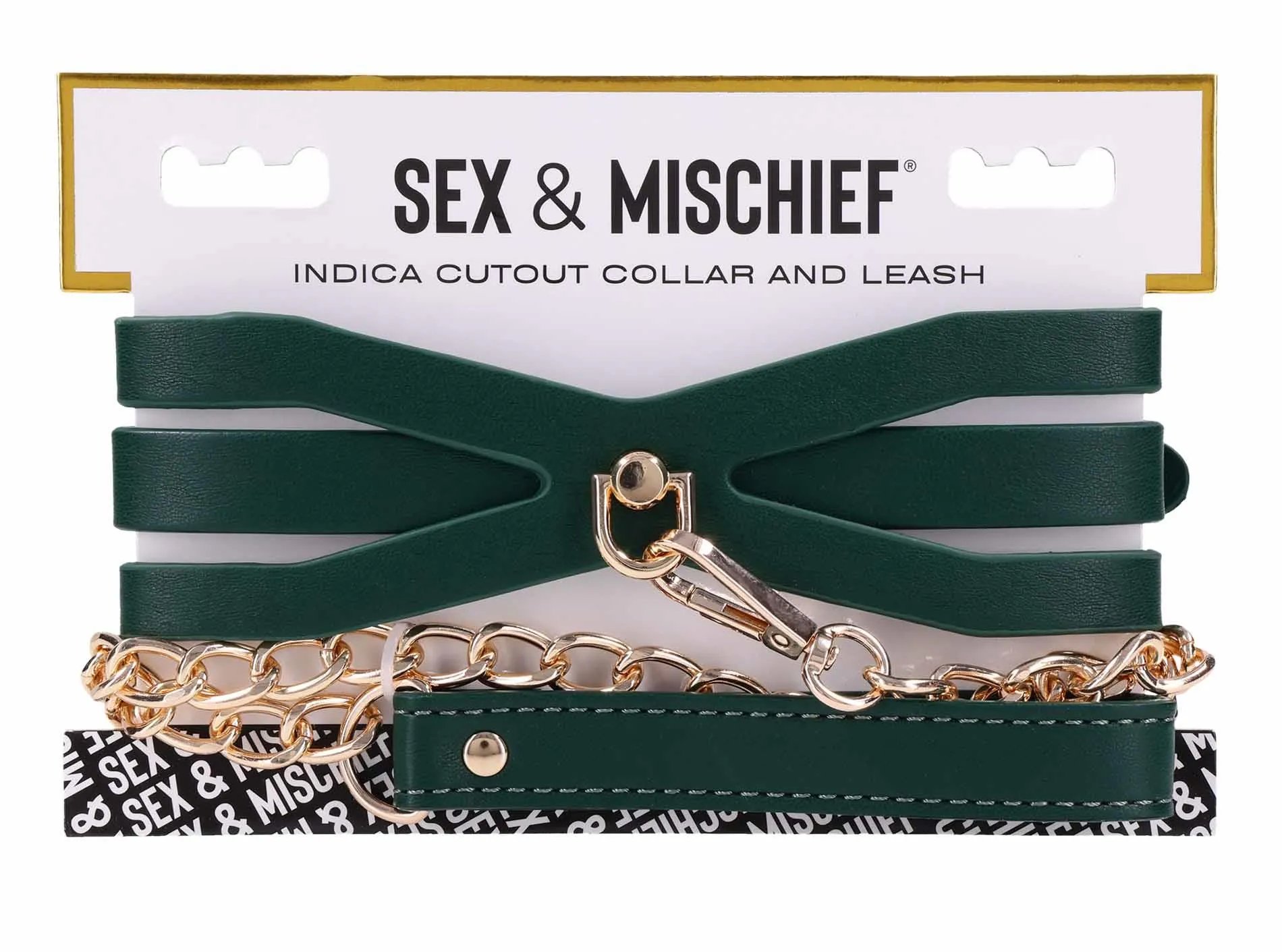 Obroża i Smycz — Indica Cutout — aksamitne wykończenie, złote okucia, regulowana to elegancki zestaw stworzony z myślą o komforcie i estetyce. Produkt wykonany jest głównie z 70% poliuretanu, przy czym elementy metalowe stanowią 25% żelaza oraz 5% stopu cynku, co zapewnia trwałość i stabilność okuć. Obroża posiada regulowane zapięcie (klamrę) umożliwiające dopasowanie do obwodu szyi w zakresie 34,3–47 cm (13.5–18.5 cala). Do zestawu dołączona jest łańcuchowa smycz o długości 91 cm (36 cali) z dopasowanym zielonym uchwytem z tego samego materiału co obroża.
