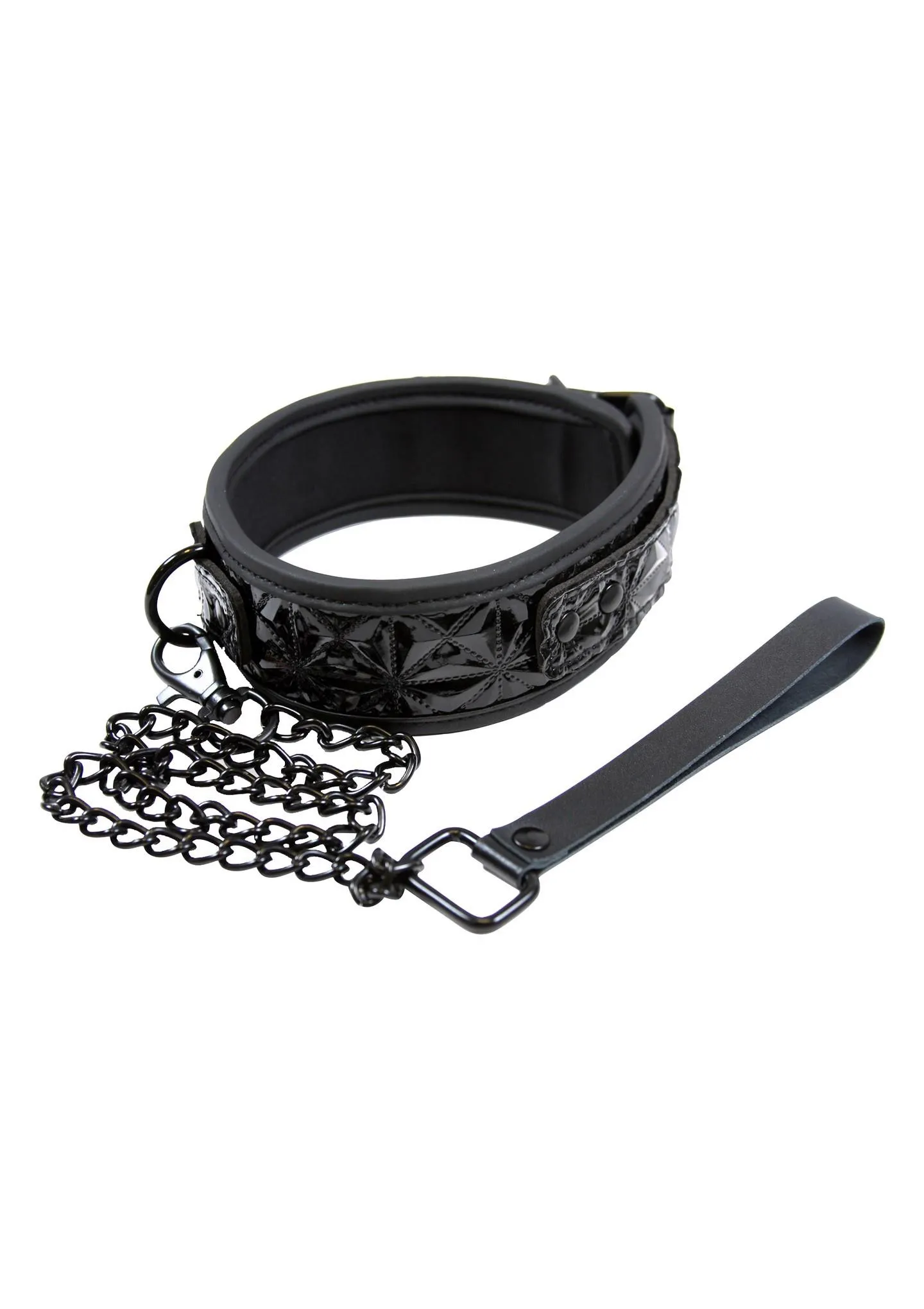 Obroża jest wykończona metalowym karabińczykiem, który nie tylko dodaje jej nowoczesnego wyglądu, ale także praktyczności w użytkowaniu. Zastosowane w niej bogato zdobione tkaniny o subtelnym połysku nadają obroży niepowtarzalnego charakteru, a jednocześnie sprawiają, że staje się ona pięknym dodatkiem do wspólnej zabawy. Właściwości te, w połączeniu z intymnością relacji i obustronnym zaufaniem, które można zbudować, ograniczając swobodę ruchów, czynią ten produkt wyjątkowym.