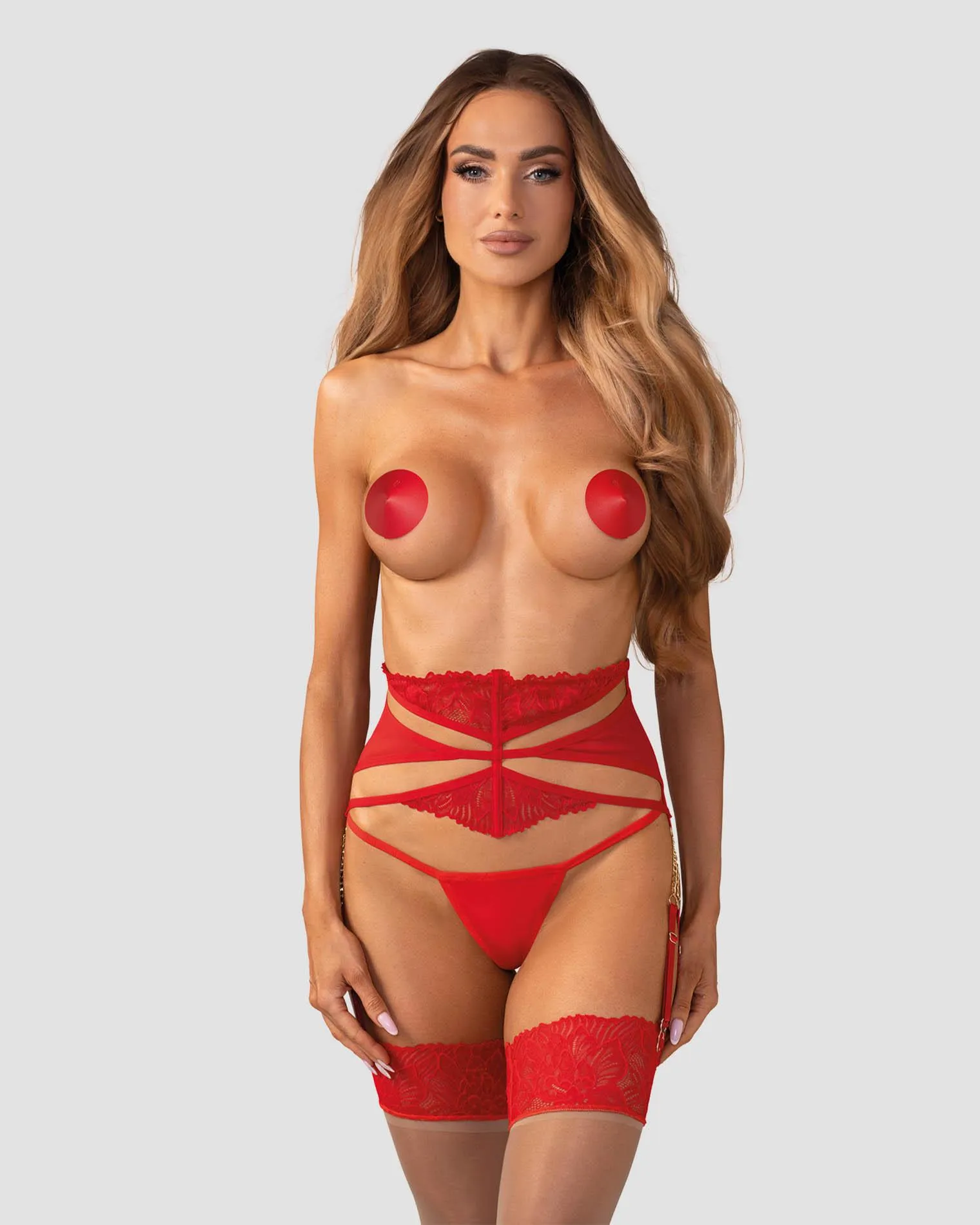 Nasza propozycja to czerwony pas do pończoch, który wyróżnia się zastosowaniem eleganckiej koronki oraz transparentnej siateczki. Ozdobne złote łańcuszki doskonale kontrastują z intensywną czerwienią, dodając całości wyjątkowego charakteru. Regulowane zapięcie z tyłu zapewnia wyjątkowe możliwości dopasowania, co sprawia, że pas ten idealnie współgra z różnorodnymi stylizacjami.