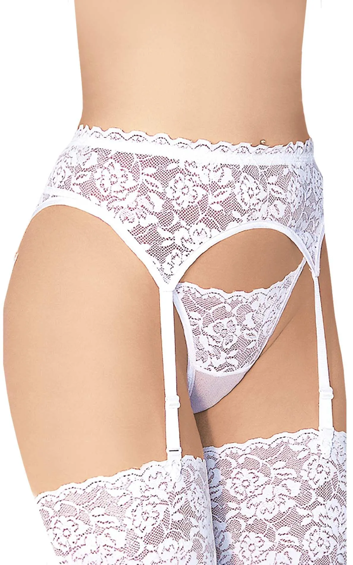 Z przodu znajduje się zmysłowo zaprojektowany pas do pończoch z zapięciem na haftki z tyłu, co zwiększa zarówno jego funkcjonalność, jak i estetykę. W zestawie znajdziesz również stringi, które łączą w sobie zmysłową siateczkę oraz kwiecistą koronkę, podkreślając kobiece piękno i figury. Tył stringów ozdobiony jest eleganckimi, cienkimi gumeczkami, co sprawia, że całość prezentuje się niezwykle kusząco i uwodzicielsko.