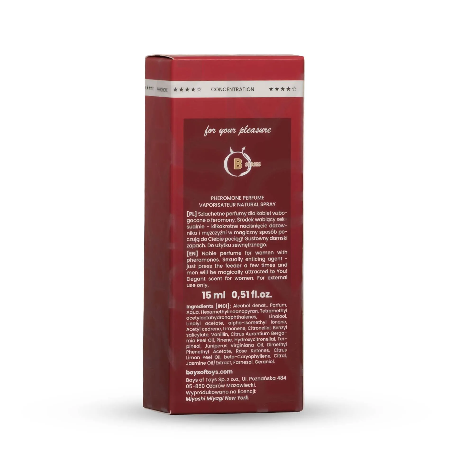 Perfumy feromonowe Miyoshi Miyagi INSTINCT to wyjątkowa propozycja dla kobiet pragnących podkreślić swoją osobowość oraz uwodzić zmysłowym zapachem. Dzięki połączeniu feromonów z oryginalnymi nutami kwiatowymi i korzennymi, stworzyliśmy kompozycję, która wyróżnia się na tle innych zapachów. To idealny wybór dla kobiet, które nie boją się być w centrum uwagi i chcą skutecznie przyciągać spojrzenia.