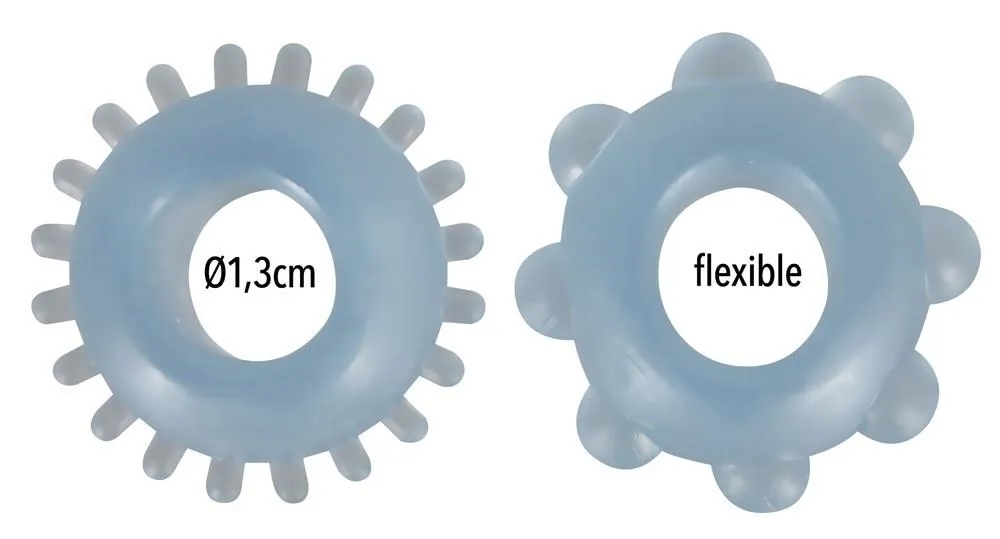 Pierścienie wykonane są z materiału TPE, który charakteryzuje się wysoką elastycznością, co pozwala na łatwe dopasowanie do indywidualnych potrzeb. Każdy z pierścieni ma wewnętrzną średnicę wynoszącą 1,3 cm, co czyni je bardzo rozciągliwymi. Dodatkowo, ich całkowita długość wynosi 2,8 cm, co sprawia, że pierścienie są ergonomiczne i wygodne w użyciu. Stymulujące nubby na pierścieniach dodają intensywności do wszelkich doświadczeń, co z pewnością umili chwile z partnerem.