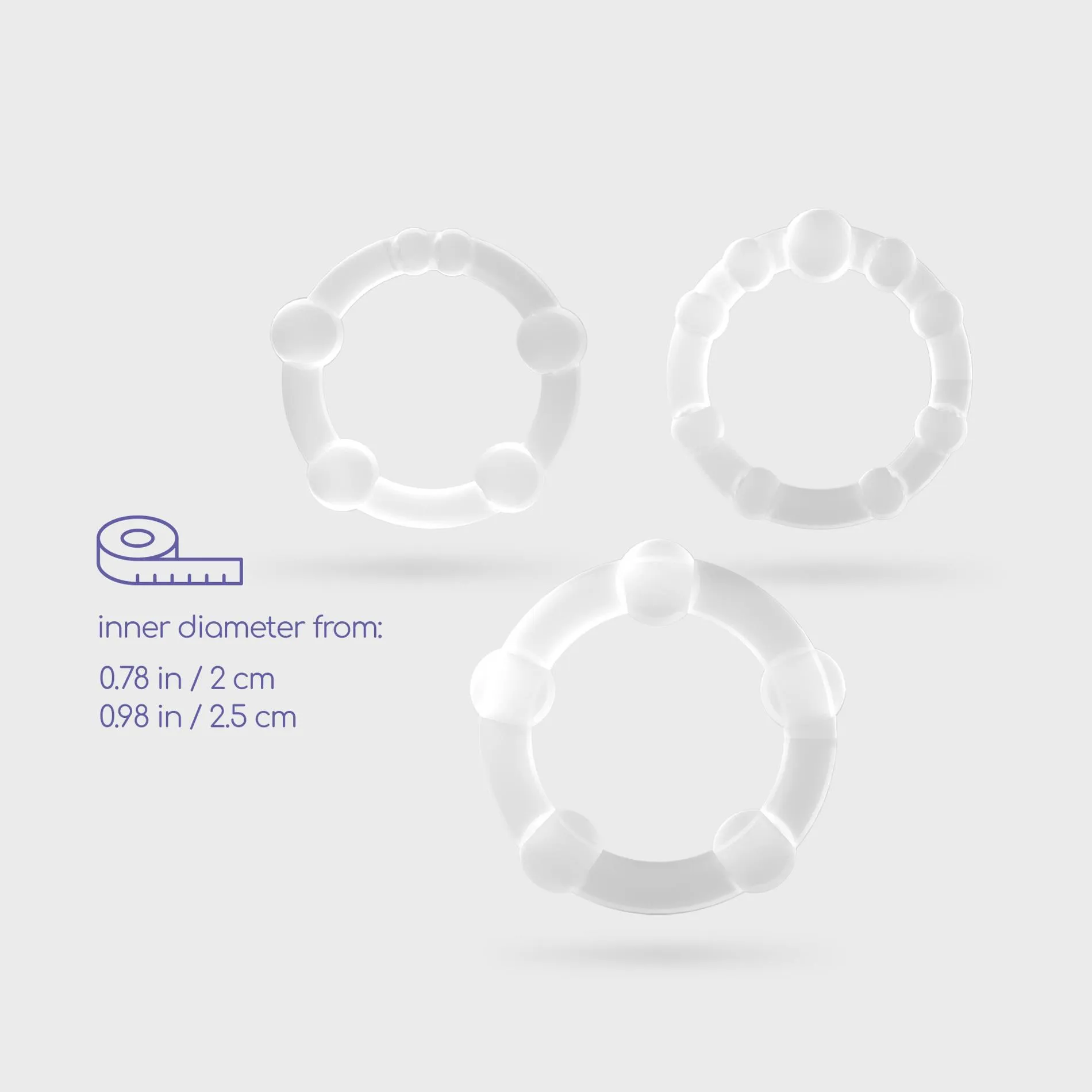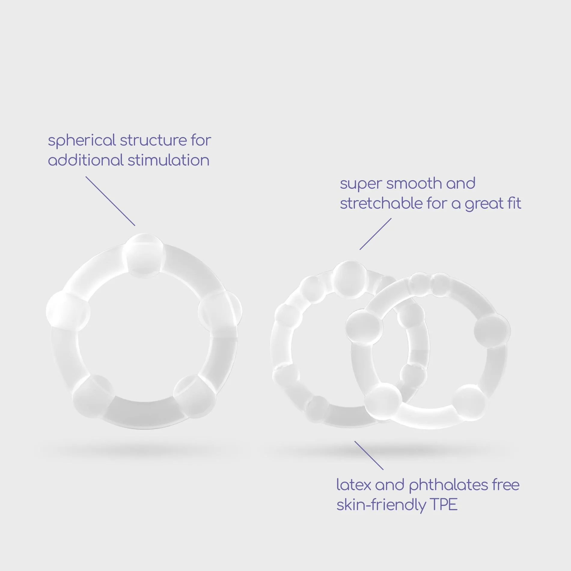 Każdy pierścień został zaprojektowany w taki sposób, aby zapewnić doskonałe dopasowanie do penisa i jąder. Użyty w produkcie elastyczny materiał nie tylko gwarantuje komfort, ale także pomaga w opóźnieniu ejakulacji oraz zwiększa wytrzymałość. Dzięki stymulującym wypustkom, pierścienie intensyfikują doznania, co pozwala na jeszcze bardziej ekscytujące chwile, zarówno w czasie zabaw solowych, jak i we dwoje.