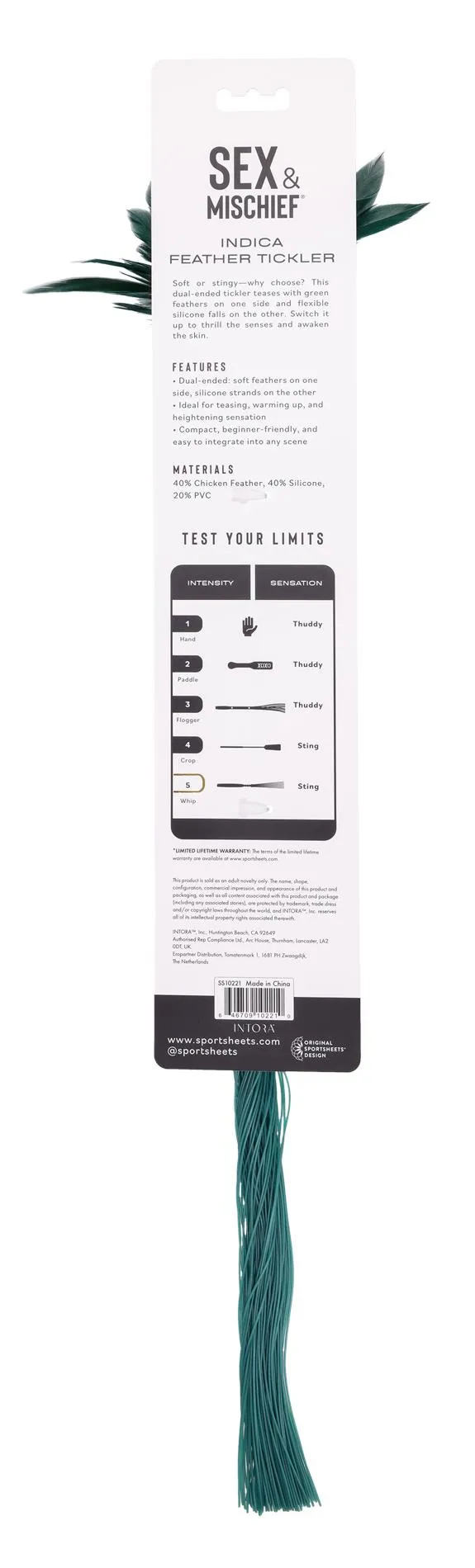 Piórkowy drażniacz (feather tickler) Indica – dwustronny: pióra + silikon, kompaktowy to precyzyjnie wykonane akcesorium przeznaczone do delikatnej stymulacji zmysłów. Produkt łączy w sobie dwa różne rodzaje bodźców: z jednej strony znajdują się miękkie pióra (40% materiału) zapewniające subtelne, łaskotliwe doznania, z drugiej zaś elastyczne paski silikonowe (40% materiału) nadające bardziej wyrazisty, lekko drażniący efekt. Pozostałe 20% konstrukcji stanowi trwałe tworzywo PVC, które wpływa na stabilność i trwałość produktu.