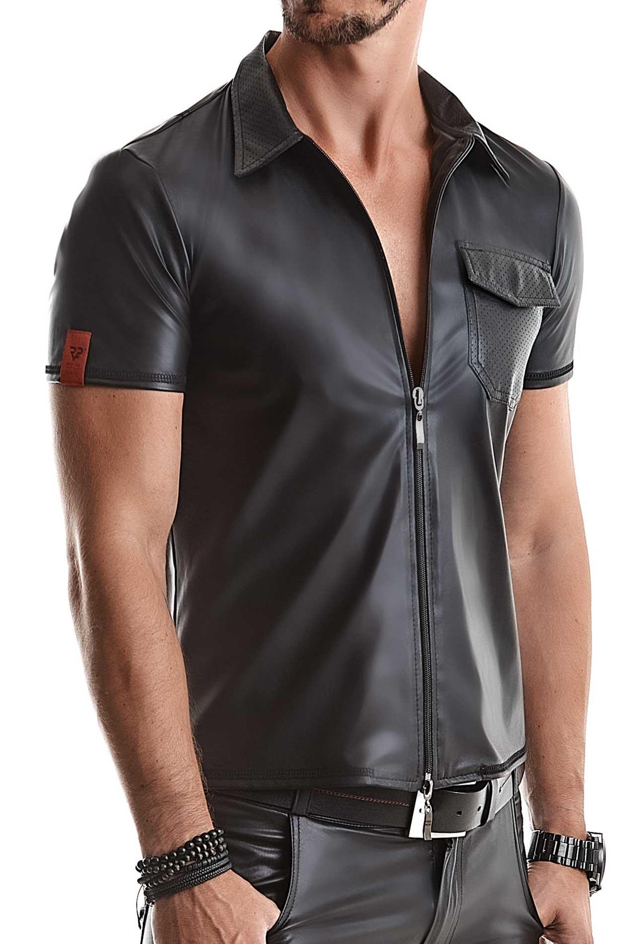 Projekt skupia się na detalach wzmacniających charakter modelu: front zdobi klasyczny kołnierzyk polo oraz perforowana kieszonka z materiału wetlook, która dodaje konstrukcji lekko industrialnego akcentu. Elementem funkcjonalnym i dekoracyjnym jest dwukierunkowy zamek błyskawiczny z grawerowanym logo RFP Regnes Fetish Planet, umożliwiający regulację odsłonięcia dekoltu oraz podkreślający marki premium. Na plecach znajdują się pionowe przeszycia, które optycznie wysmuklają talię i eksponują linię barków oraz klatki piersiowej, nadając sylwetce bardziej muskularny wygląd.