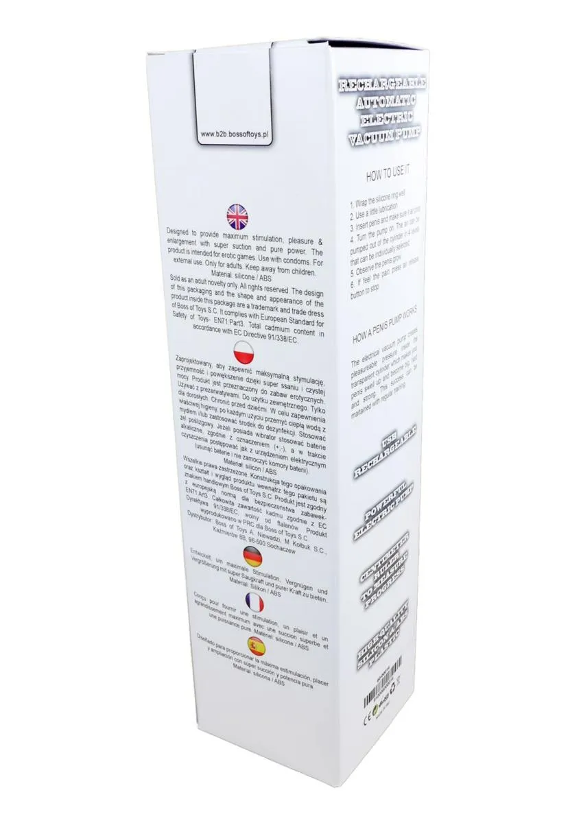 Urządzenie pracuje na zasadzie generowania podciśnienia, które stymuluje przepływ krwi do członka, co może prowadzić do widocznego zwiększenia jego rozmiarów. Użytkowanie pompki wpływa korzystnie na jakość erekcji oraz wrażliwość na bodźce. W miarę regularnego korzystania, efektem mogą być zarówno zwiększone doznania, jak i stabilne rezultaty. Pompka charakteryzuje się intuicyjnym sterowaniem, gdzie moc ssania dostosujesz za pomocą przycisków. Na wyświetlaczu LED znajdziesz informacje o poziomie ciśnienia, czasie działania oraz stopniu naładowania baterii.
