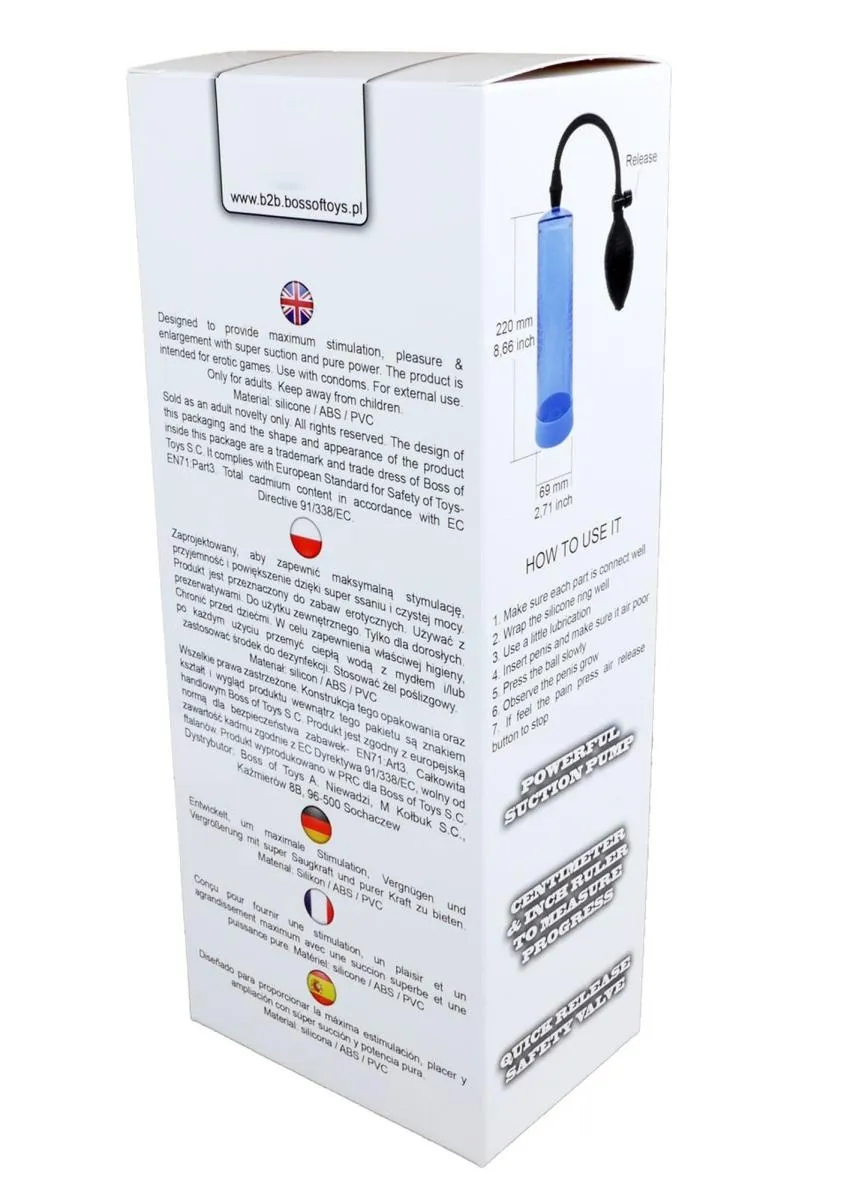 Pompa próżniowa Pompka-Powerpump to innowacyjny produkt przeznaczony dla mężczyzn, którzy pragną eksplorować nowe możliwości i poprawić swoje doznania. Jej długość 22 cm oraz zastosowanie wysokiej jakości materiałów, takich jak silikon i ABS, sprawiają, że jest to produkt nie tylko skuteczny, ale także bezpieczny i komfortowy w codziennym użytkowaniu. Dzięki unikalnej budowie, pompka ta zapewnia wydajne i długotrwałe działanie.