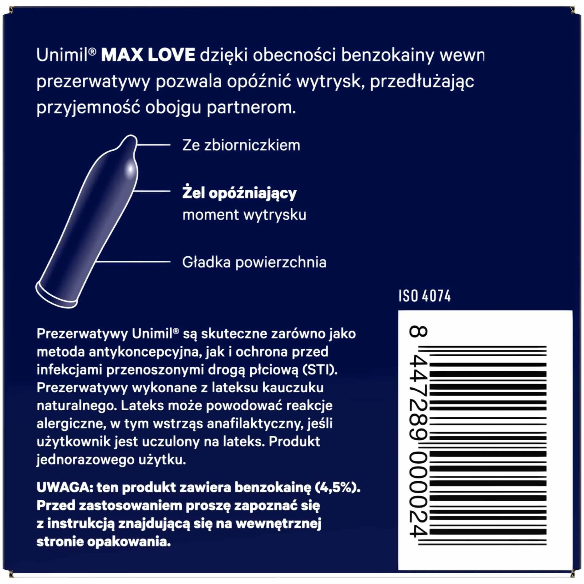 Wykonane z naturalnego lateksu kauczukowego, prezerwatywy te charakteryzują się gładką powierzchnią, co zapewnia przyjemniejsze doznania zarówno dla mężczyzn, jak i kobiet. Zakończone zbiorniczkiem, gwarantują skuteczną ochronę i komfort użytkowania, zapewniając jednocześnie bezpieczeństwo podczas stosunków seksualnych. Użycie prezerwatyw Unimil MAX LOVE pozwala na skuteczną antykoncepcję oraz stanowi barierę przed infekcjami przenoszonymi drogą płciową (STD).