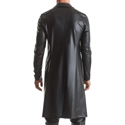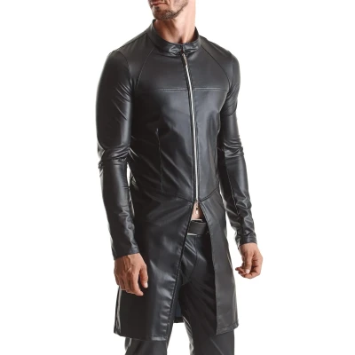 Płaszcz damski RMMario001 - czarny, elastyczny, L, fetyszowy stylem, z kontrastowymi przeszyciami