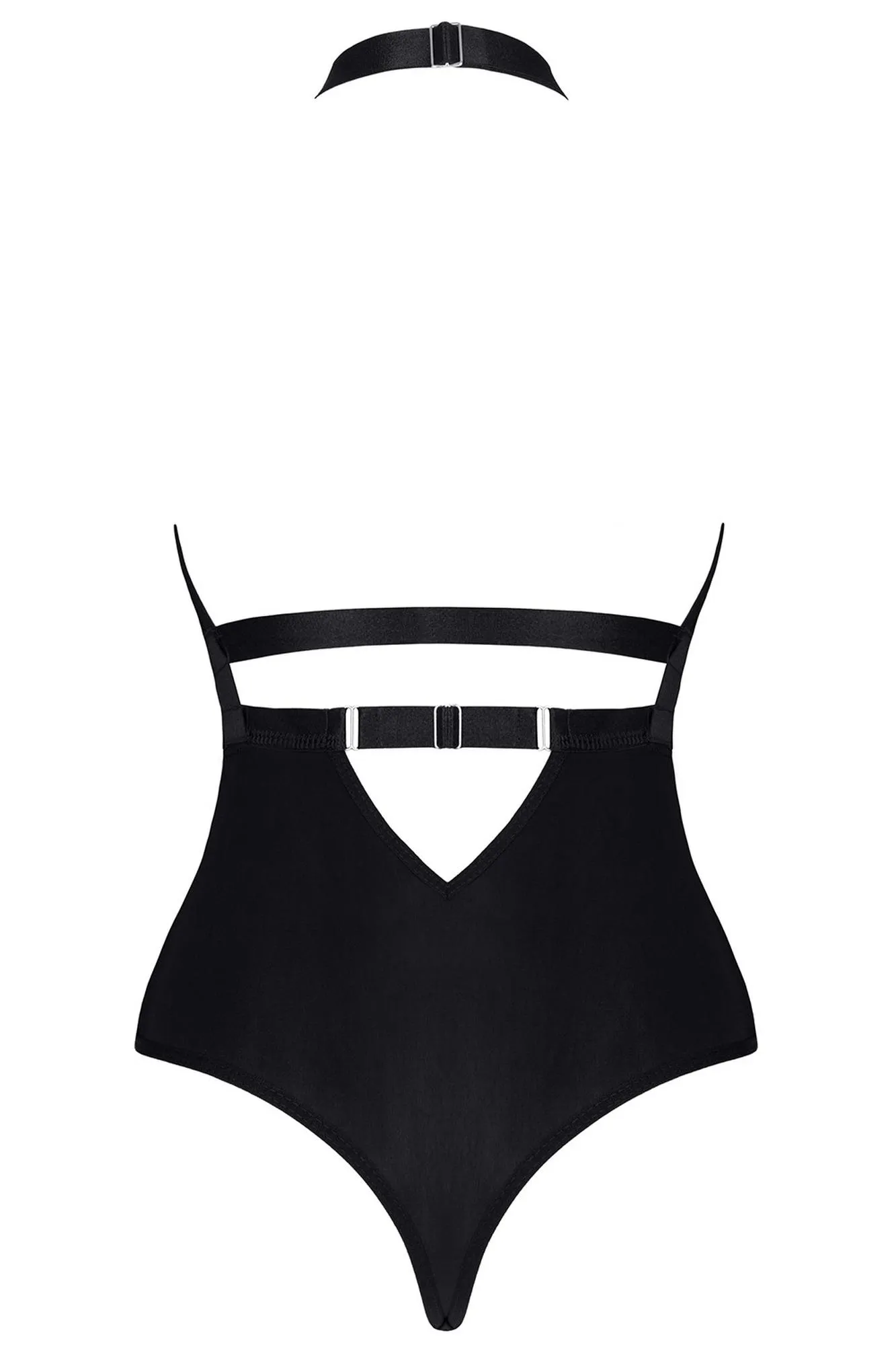 Aleta001 to seksowne i wygodne body, które łączy w sobie elegancję oraz komfort. Wykonane z przyjemnego w dotyku materiału w kolorze czarnym, body posiada ekskluzywne detale, które z pewnością przyciągną uwagę. Geometryczny dekolt z przodu zdobiony czarną koronką dodaje całości wyrafinowania, a ozdobne srebrne kółka w połączeniu z czarnymi gumkami podkreślają nowoczesny charakter modelu. Dodatkowo, srebrny regulator na szyi z tyłu pozwala na idealne dopasowanie.
