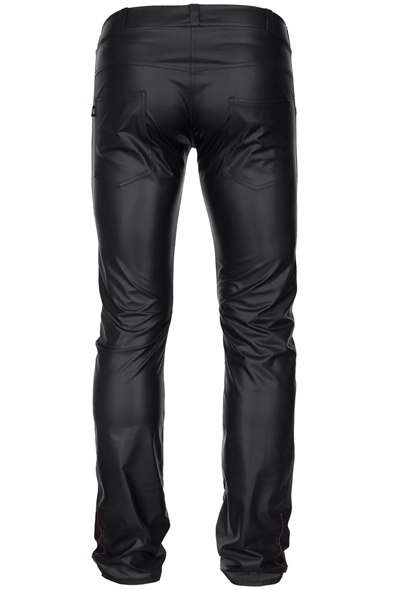 Spodnie wetlook RFP RMVittorio001 to propozycja dla osób, które cenią sobie zarówno styl, jak i komfort. Wykonane w całości z elastycznego materiału wetlook, te czarne spodnie charakteryzują się obniżonym stanem, co nadaje im nowoczesny oraz zmysłowy charakter. Ich projekt został stworzony z myślą o podkreśleniu sylwetki, a szczególne wykończenie w postaci zwężonej linii bioder sprawia, że idealnie podkreślają kształt pośladków.