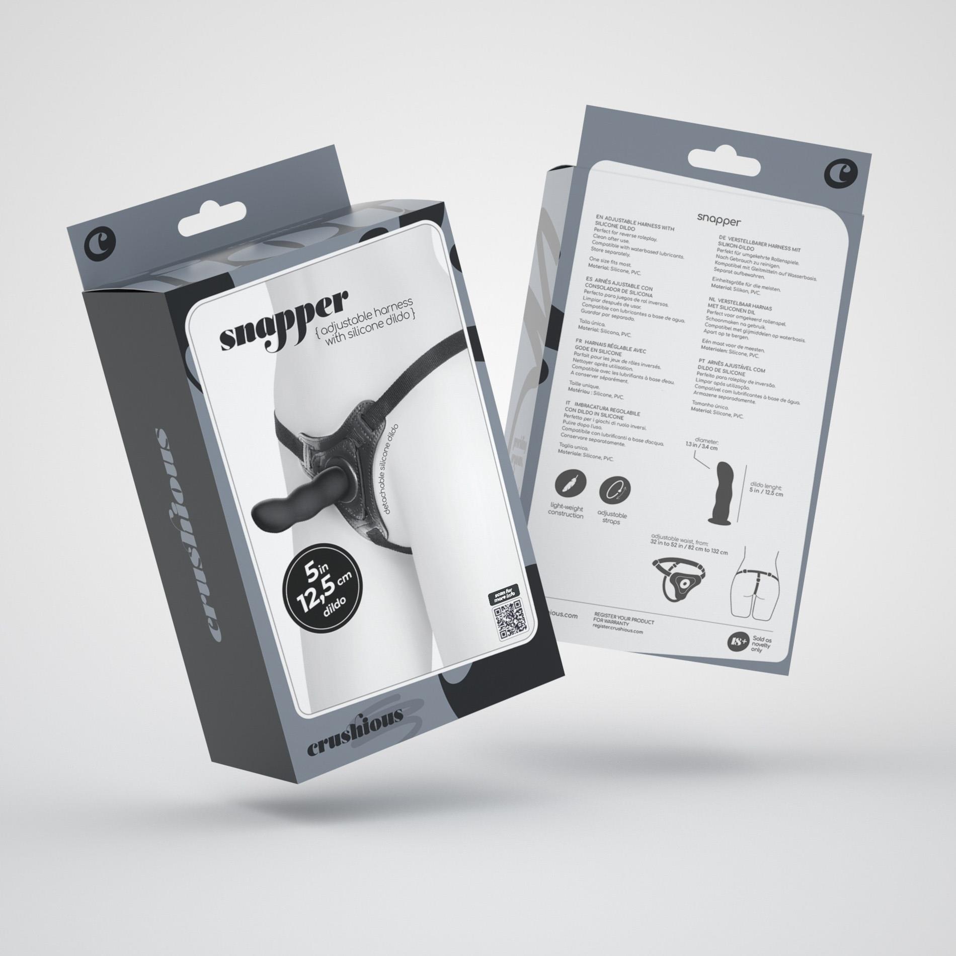 Falowany kształt Snappera zapewnia wyjątkową stymulację, zarówno waginalną, jak i analną. Produkt składa się z dwóch części: praktycznego uniwersalnego harnessu, który pasuje do większości sylwetek i dildo wykonanym z wysokiej jakości silikonu. Dzięki zapinaniu na zatrzask, montaż oraz demontaż dildo jest szybki i łatwy, co znacząco upraszcza proces czyszczenia. Wykonanie z materiałów takich jak silikon i PVC gwarantuje bezpieczeństwo oraz komfort użytkowania.