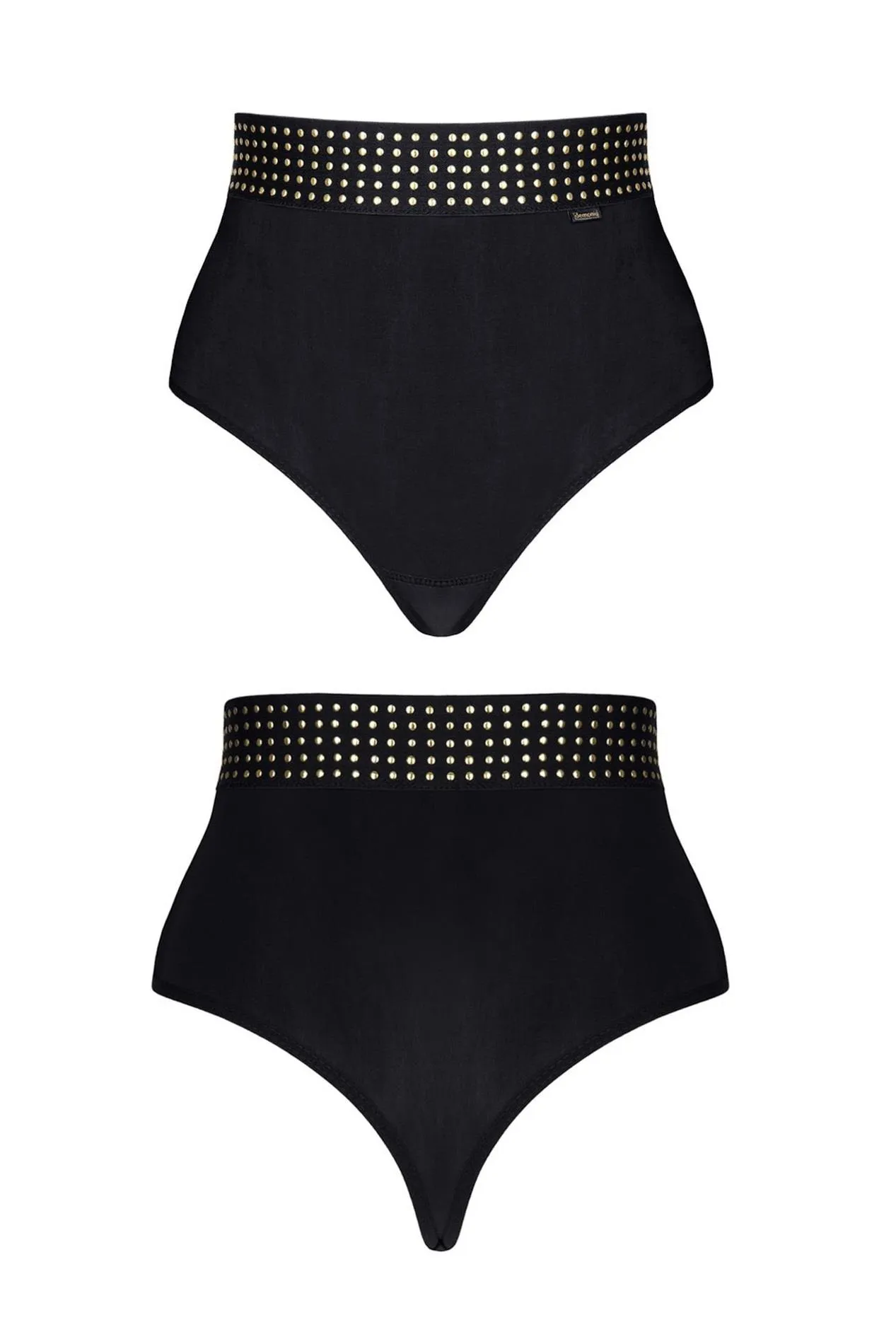 Model ten wyróżnia się przede wszystkim seksownym krojem, który z tyłu efektownie akcentuje krągłości pośladków. Szeroka, czarna gumka na górze ozdobiona jest delikatnymi aplikacjami w kształcie drobnych, złotych kółek, co nadaje im wyjątkowy styl i charakter. Stringi są dostępne w różnych rozmiarach, co sprawia, że każda kobieta znajdzie idealnie dopasowany model dla siebie: