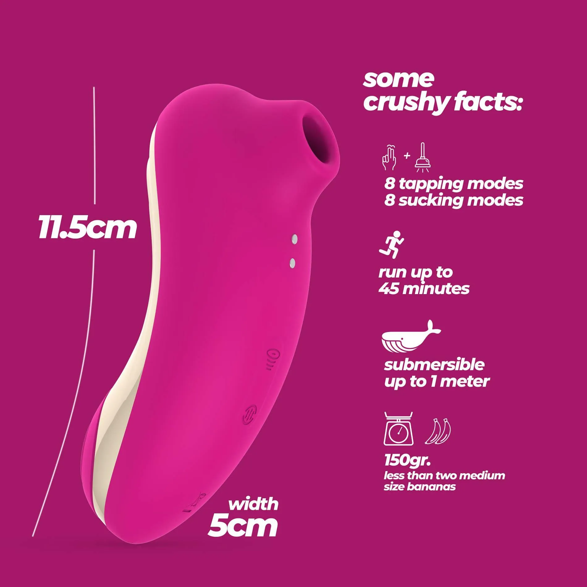 Crushious Supernova – stymulator łechtaczki łączący technologię ssania i tappingu został zaprojektowany z myślą o precyzyjnej, intensywnej i zróżnicowanej stymulacji. Urządzenie oferuje 8 trybów ssania oraz 8 trybów tappingu, co pozwala na indywidualne dopasowanie doznań od delikatnych po bardzo intensywne. Ergonomiczna obudowa zapewnia pewny chwyt i wygodę podczas użytkowania, a kompaktowe wymiary — długość całkowita 11,5 cm i średnica 5 cm — ułatwiają kontrolę nad pozycją i natężeniem bodźców.