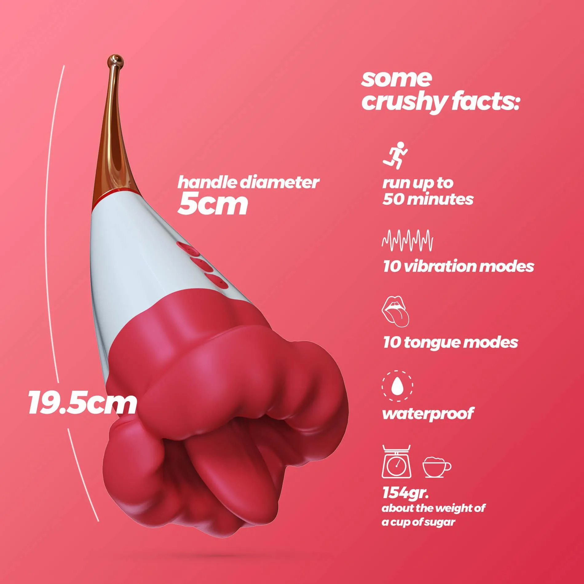 Każdy z 10 trybów wibracji pozwala na wyjątkowe eksploracje, oferując różnorodne doznania zarówno przy użyciu wymiennych końcówek, jak i bez nich. Ciesz się ich unikalnością, dobierając idealny tryb do nastroju. Zasilany akumulatorem, Stymulator Crushious Jagger ładowany jest przez 120 minut dla pełnej mocy, a 50 minut nieprzerwanej przyjemności to czas, który możesz spędzić, odkrywając swoje najbardziej intymne pragnienia.