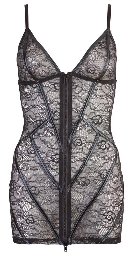 Model ten zachwyca delikatną kwiatową koronką, która nadaje mu unikalnego charakteru. Regulowane paski pozwalają na idealne dopasowanie do ramion, a ekskluzywny dwukierunkowy zamek błyskawiczny na całej długości dodaje odrobiny pikanterii, umożliwiając łatwe odkrycie skrytych atrakcji. Sukienka z przodu ma rockowe paski wet look, co kontrastuje z subtelnością koronki i tworzy niepowtarzalny efekt wizualny.