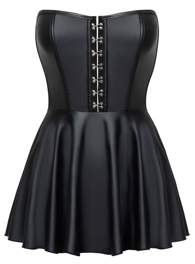Sukienka charakteryzuje się obcisłym, pochlebny topem w stylu gorsetu, który doskonale modeluje figurę. Bez ramiączek design z profilowanymi wstawkami dodaje jej wyjątkowego charakteru. Dodatkowo, ozdobne srebrne haczyki i oczka z przodu umożliwiają łatwe zakładanie i zdejmowanie, dodając subtelności całości.
