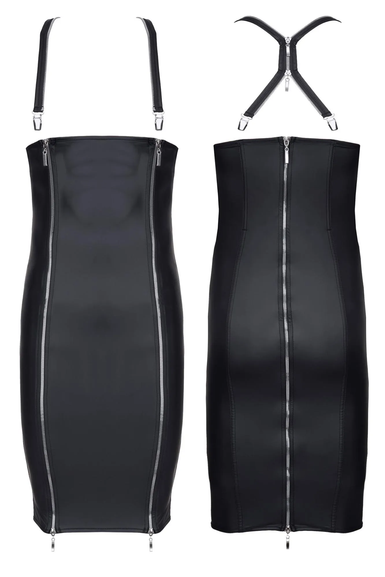 W sukience zastosowano trzy suwakowe zamki błyskawiczne: dwa z przodu oraz jeden z tyłu, które nie tylko pełnią funkcję dekoracyjną, ale również umożliwiają wygodne zakładanie. Odpinane zamki otwierają możliwości do zmysłowych prowokacji, czyniąc ją idealnym wyborem na wyjątkowe okazje. Sukienka została wyposażona w regulowane szelki, które posiadają ozdobne, metalowe zapięcia, co dodatkowo wzmacnia jej ekspresyjny wygląd.