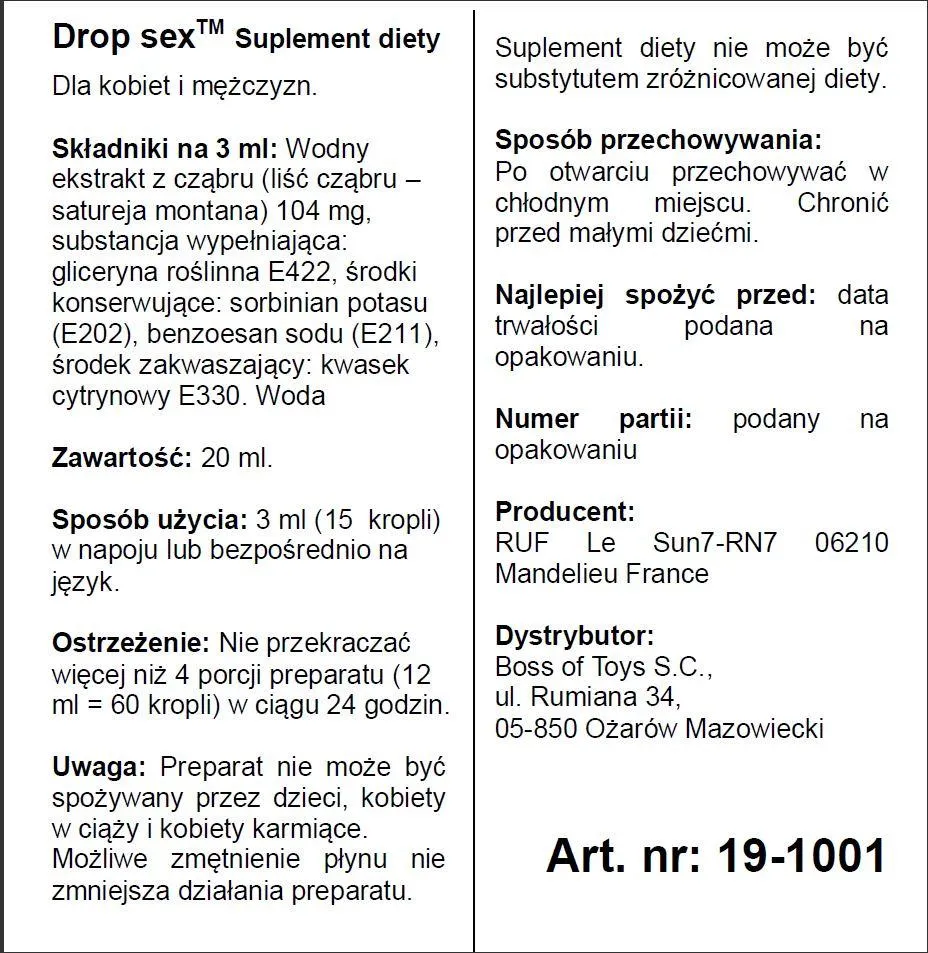 Suplement diety DROP SEX w pojemności 20 ml to nowoczesny produkt stworzony z myślą o wzroście libido zarówno u kobiet, jak i mężczyzn. Jego formuła dedykowana jest osobom pragnącym poprawić swoje doznania intymne i zwiększyć apetyt na seks. Dzięki zastosowaniu naturalnych składników, DROP SEX działa stymulująco na organizm, aktywując krążenie w okolicach intymnych, co przyczynia się do intensyfikacji doznań i satysfakcji w relacjach seksualnych.