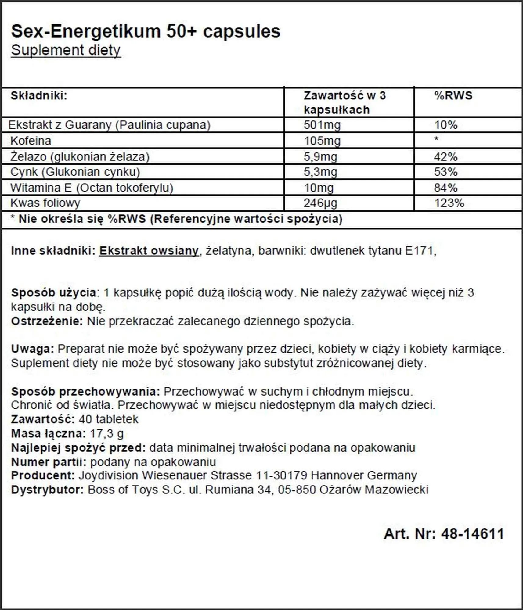 Suplement diety EROpharm - Seks-Energetikum 50+ to starannie opracowany produkt, który ma na celu wspieranie mężczyzn po pięćdziesiątym roku życia w odzyskaniu młodzieńczej witalności oraz zwiększeniu ich seksualnej sprawności. W miarę upływu czasu, wielu mężczyzn doświadcza naturalnych spadków energii oraz libido; nasz suplement dostarcza niezbędne składniki odżywcze, które mogą przyczynić się do poprawy jakości życia intymnego.