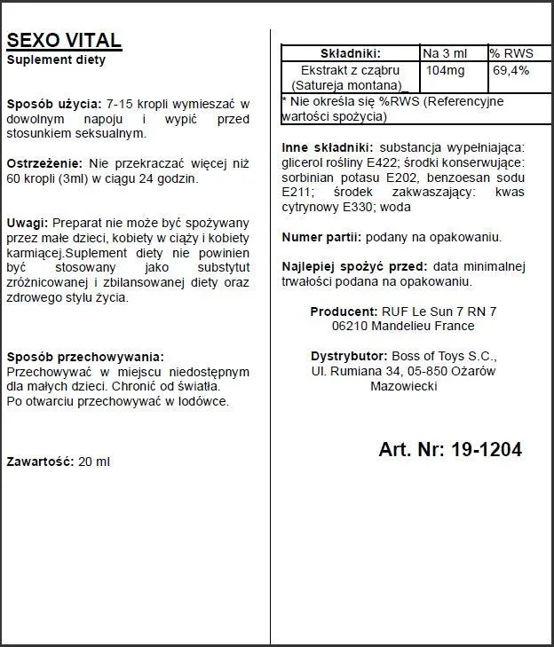 Suplement diety - Sexovital, Krople miłości to zaawansowany ziołowy suplement diety, stworzony specjalnie dla kobiet i mężczyzn pragnących wzbogacić swoje życie intymne. Zawierający ekstrakt z hiszpańskiej muchy, oferuje szybkie działanie, które może być odczuwalne już w kilka minut po zastosowaniu. Jego unikalna formuła została zaprojektowana z myślą o podniesieniu jakości doznań erotycznych oraz intensyfikacji przeżyć seksualnych.
