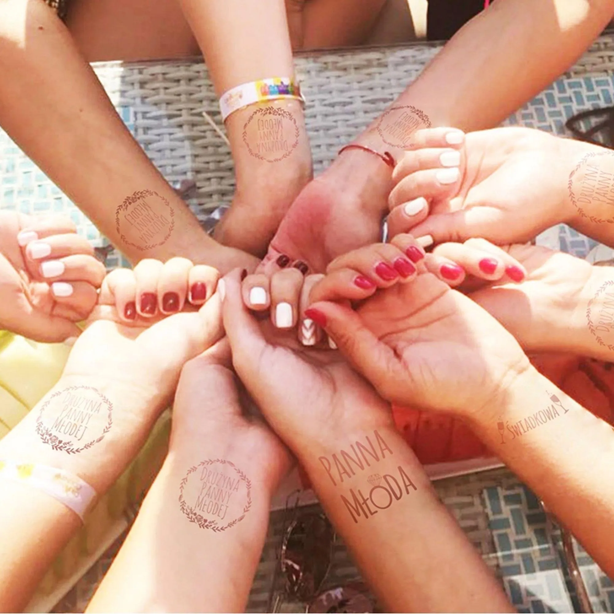 Oferujemy Tatuaż tymczasowy - Zestaw Rose Gold, 12 szt., Panna Młoda i Drużyna, dermatologiczny — elegancki komplet stworzony z myślą o wieczorach panieńskich, sesjach zdjęciowych i dekoracji imprezowych. Zestaw zawiera 12 pojedynczych wzorów w metalicznym odcieniu rose gold: 1 x tatuaż Panna Młoda, 1 x tatuaż Świadkowa oraz 10 x tatuaż Drużyna Panny Młodej. Produkty są testowane dermatologicznie, co potwierdza ich zgodność ze standardami bezpieczeństwa skóry dla dorosłych użytkowników.