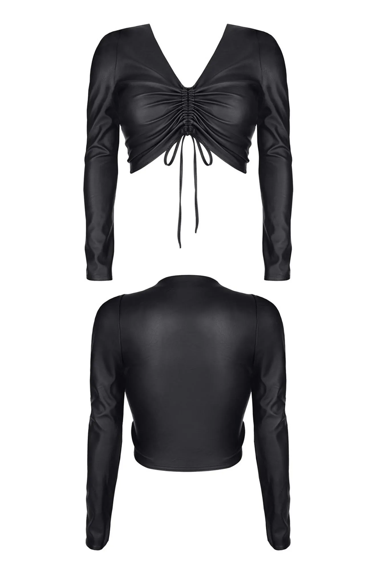 Jednym z najważniejszych elementów tego topu jest efektowny dekolt ze sznureczkami ściągającymi, który daje możliwość kreowania różnych stylizacji. Dzięki sznureczkom można w prosty sposób modyfikować kształt dekoltu – mocne ściągnięcie sznureczków pozwala uzyskać dekolt w kształcie trójkąta, a luźne wiązanie zapewnia seksowny wygląd z zakrytą częścią brzucha. Długie rękawy dodają całości klasycznego wyrazu, a jednocześnie sprawiają, że top jest idealny na różne okazje.