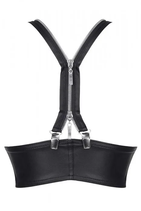 Dużym atutem są odpinane szelki, których oryginalny design cechuje się decorative strapkami oraz mechanizmem regulacji długości. Dzięki temu możesz dostosować top do swojej stylizacji, a także komfortu. Wykonany z czarnej elastycznej ekoskóry z fakturą przypominającą prawdziwą skórę, top jest nie tylko estetyczny, ale również praktyczny. Materiał jest miły w dotyku, co sprawia, że noszenie go to prawdziwa przyjemność.