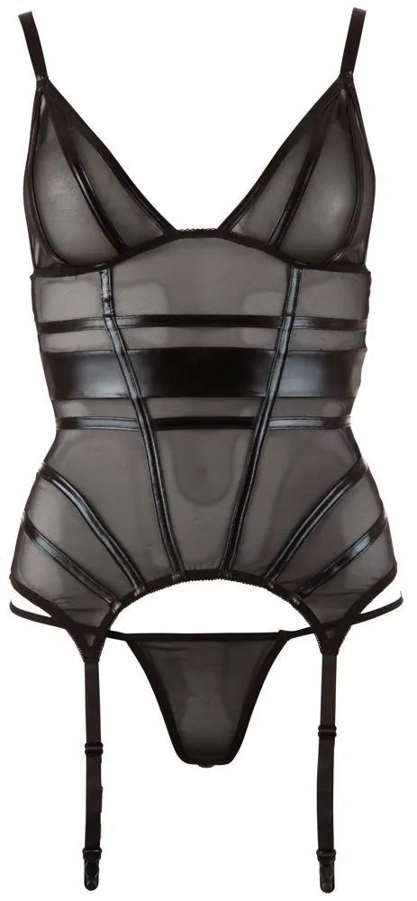 Top ma regulowane paski oraz cztery szelki, co sprawia, że można go idealnie dopasować do sylwetki. Z tyłu znajduje się praktyczne zapięcie na haczyk, które umożliwia łatwe zakładanie i zdejmowanie. Całość dopełniają stringi, wykonane w całości z przezroczystego powernetu, które zapewniają komfort i elegancję jednocześnie.
