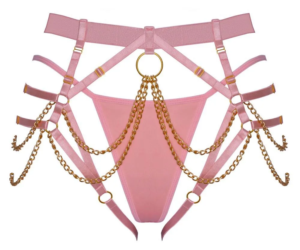 Uprząż string Bad Kitty to niezwykle elegancka i zmysłowa propozycja dla pewnych siebie kobiet, które pragną podkreślić swoje atuty. Wykonana z różowych, delikatnie połyskujących, elastycznych materiałów, ta uprząż łączy w sobie nowoczesny design z klasycznymi akcentami. Ozdobiona złotymi elementami i zmysłowymi łańcuszkami, które harmonijnie współgrają z linią ciała, staje się idealnym uzupełnieniem każdej bielizny, dodając wyjątkowego charaktery oraz luksusowego wyglądu.