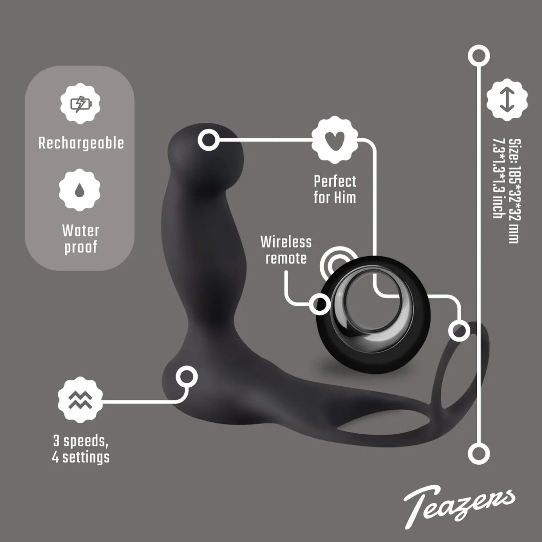 Odkryj niespotykaną przyjemność z Wibratorem analnym Teazers, który łączy w sobie funkcjonalność pierścienia na penisa i skutecznego stymulatora prostaty. To innowacyjne urządzenie zapewnia intensywną stymulację dzięki różnorodnym trybom wibracji, które są łatwe w obsłudze dzięki bezprzewodowemu pilotowi. Wibracje dostępne są w 3 prędkościach i 4 unikalnych wzorach, co pozwala na personalizację doświadczeń. Jego elastyczne pierścienie, zaprojektowane z myślą o komforcie, można założyć na półsztywny penis i mosznę, a wewnętrzny stymulator prostaty można wprowadzić przy użyciu lubrykantu na bazie wody.