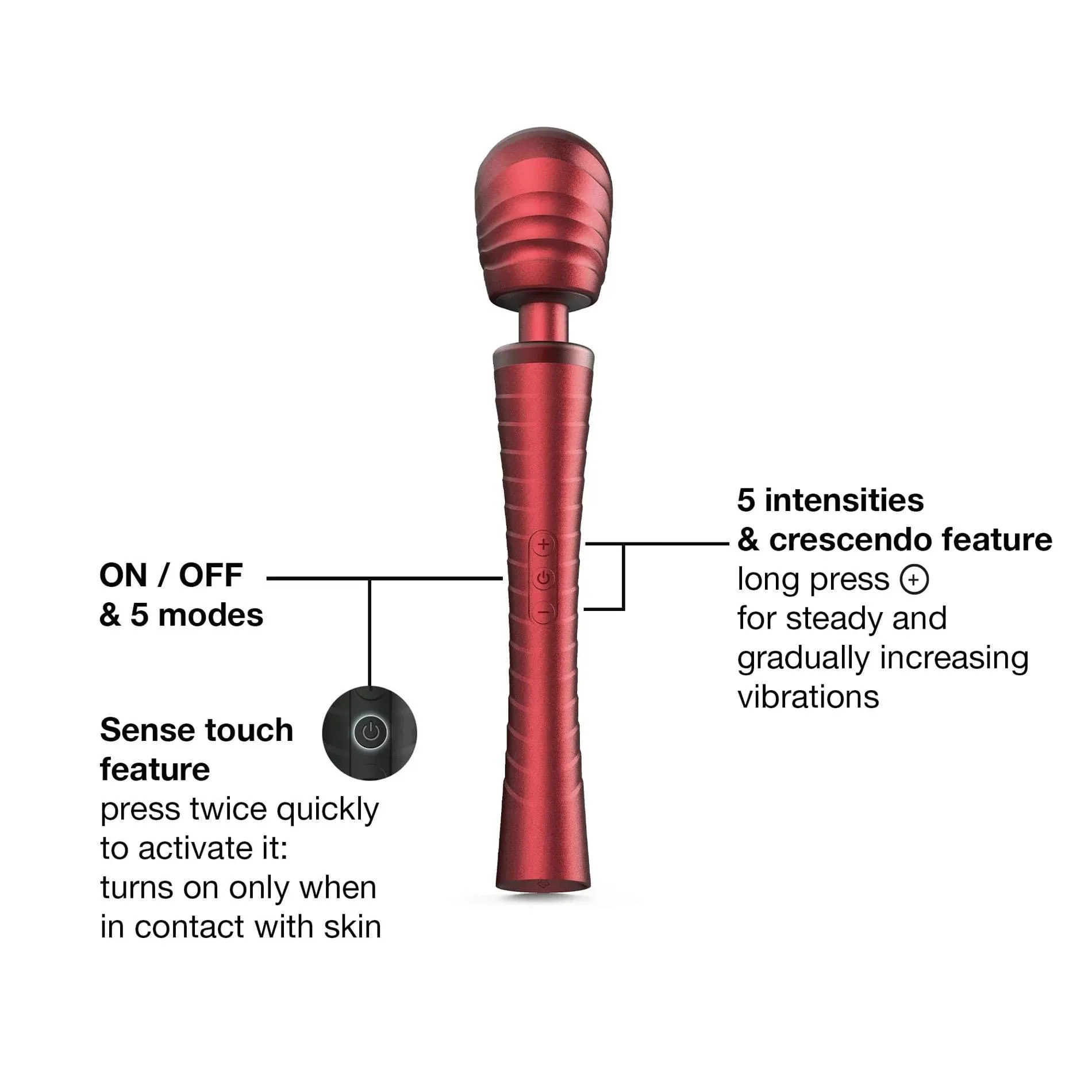 Ergonomiczna konstrukcja z elastyczną, wymienną główką umożliwia wygodne dopasowanie do różnych stref erogennych. W zestawie znajdują się dwie końcówki: profilowana do punktowej stymulacji bez konieczności posuwistych ruchów oraz karbowana, przeznaczona do użycia z lubrykantem na bazie wody dla wzmocnionych wrażeń. Technologia Sense Touch aktywuje wibracje wyłącznie przy kontakcie ze skórą, co zapewnia intuicyjne i dyskretne użytkowanie, a blokada podróżna zabezpiecza przed przypadkowym włączeniem podczas transportu.