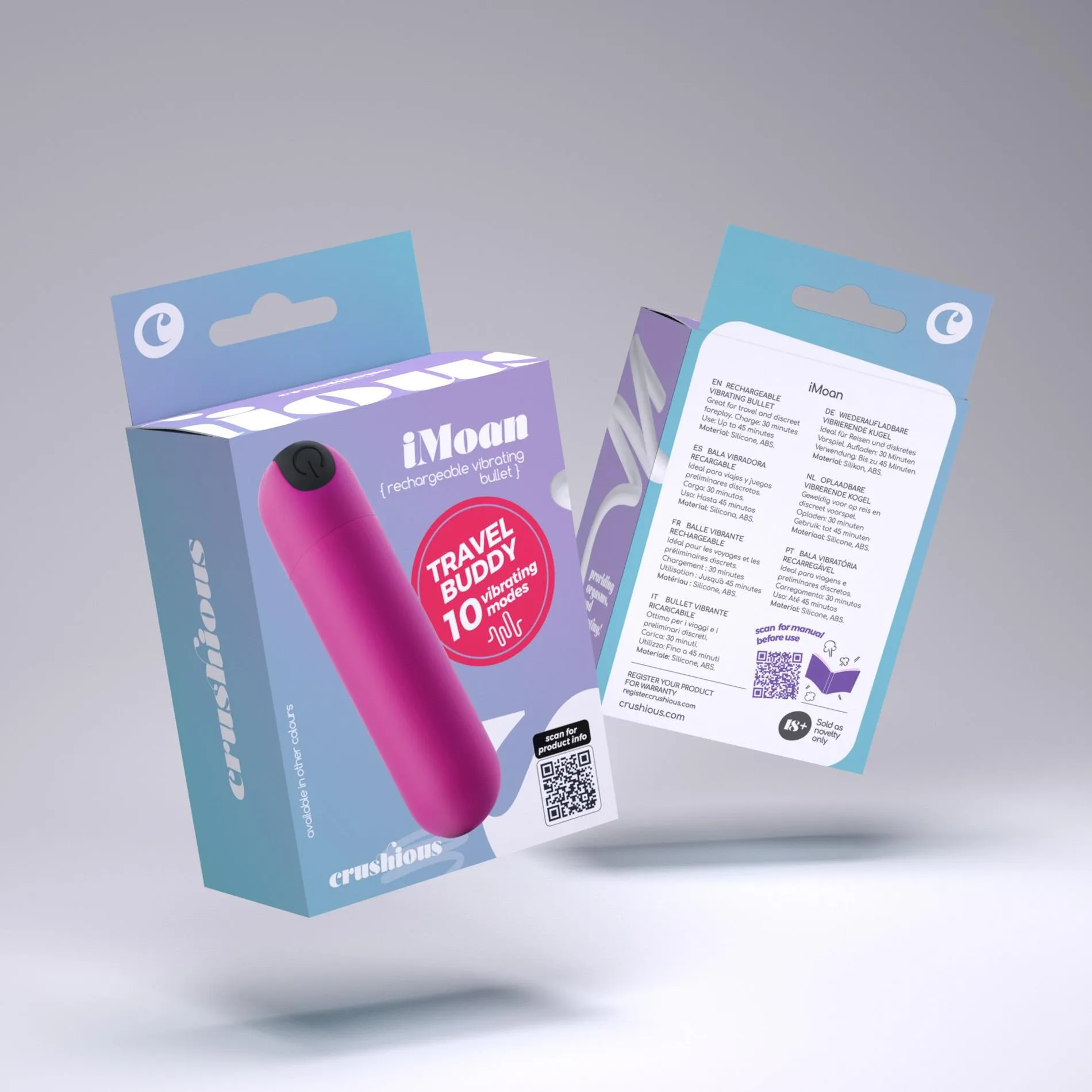 Wykonany z bezpiecznego silikonu o aksamitnej powierzchni, iMoan dba o Twoją skórę, jest wolny od ftalanów i całkowicie nieszkodliwy. Aby zwiększyć komfort użytkowania, stosuj lubrykanty na bazie wody, takie jak Crushious Waterbased. Pamiętaj, aby po każdej sesji dokładnie oczyścić wibrator ciepłą wodą z neutralnym mydłem lub użyć bezalkoholowego środka czyszczącego do zabawek Crushious. Wymiary wibratora to: całkowita długość 7,6 cm oraz średnica 2 cm, co sprawia, że jest wygodny i poręczny w każdym użyciu.