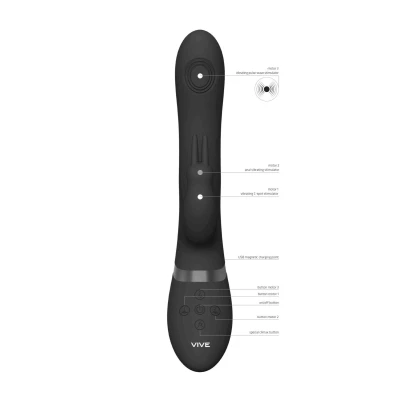Produkt jest wyposażony w dwa silniki, które umożliwiają intensywne i głębokie wibracje, dostępne w trzech prędkościach oraz siedmiu rytmach. Użytkowanie wibratora jest niezwykle proste dzięki trzem przyciskom, które pozwalają na indywidualne dostosowanie doznań. Każda część wibratora ma własny silnik i przycisk, co umożliwia precyzyjne zarządzanie stymulacją.