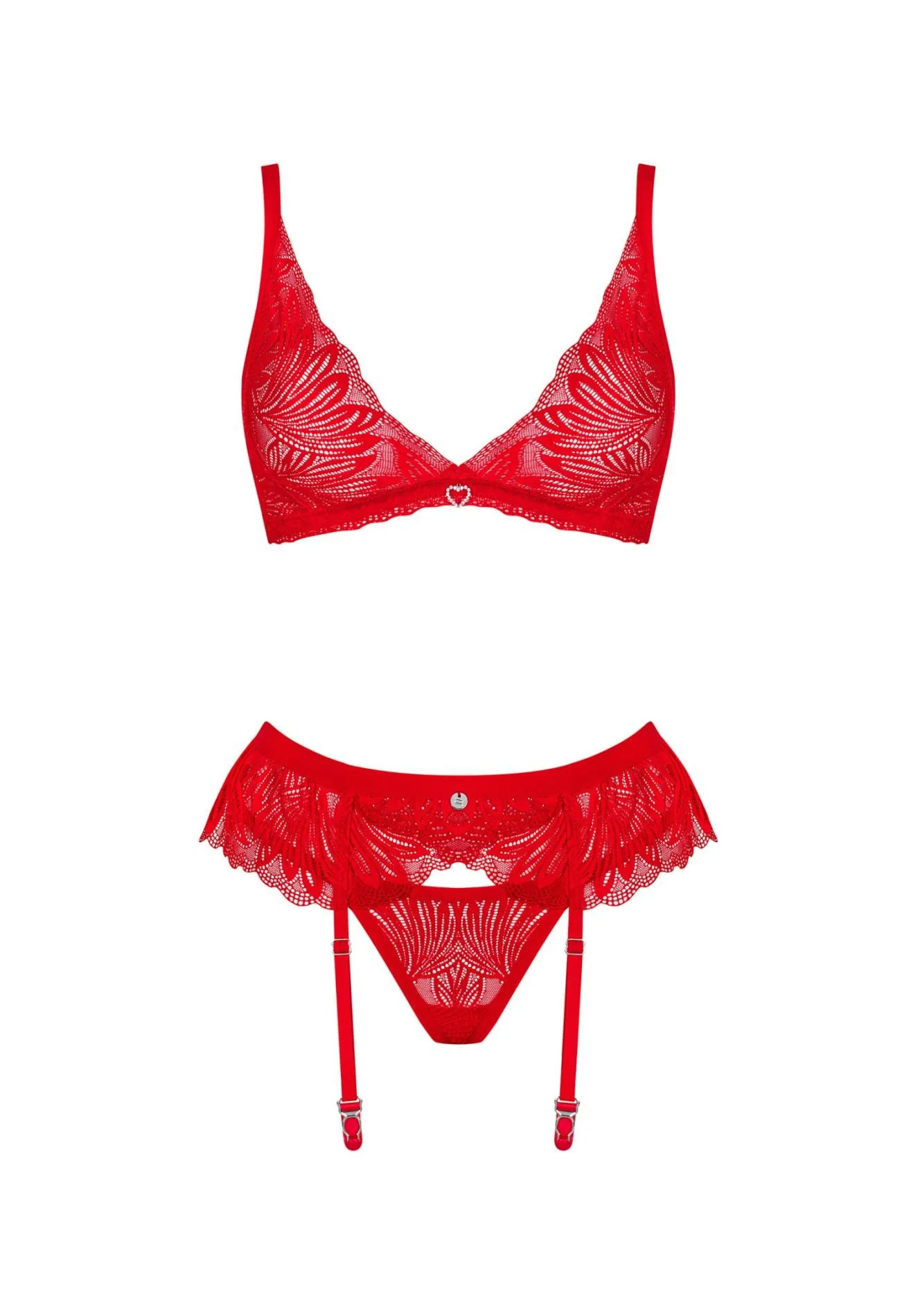 Zachwycające koronkowe wykończenia w oryginalnym wzorze oraz eleganckie dodatki, takie jak srebrne serduszko z cyrkoniami, nadają zestawowi unikalnego charakteru. Regulowane ramiączka oraz kilkustopniowe zapięcie biustonosza oferują możliwość idealnego dopasowania, co sprawia, że możesz cieszyć się wygodą i pewnością siebie w każdej sytuacji. Zestaw jest również wzbogacony o kolor oraz teksturę, które przyciągną wzrok i pobudzą zmysły.